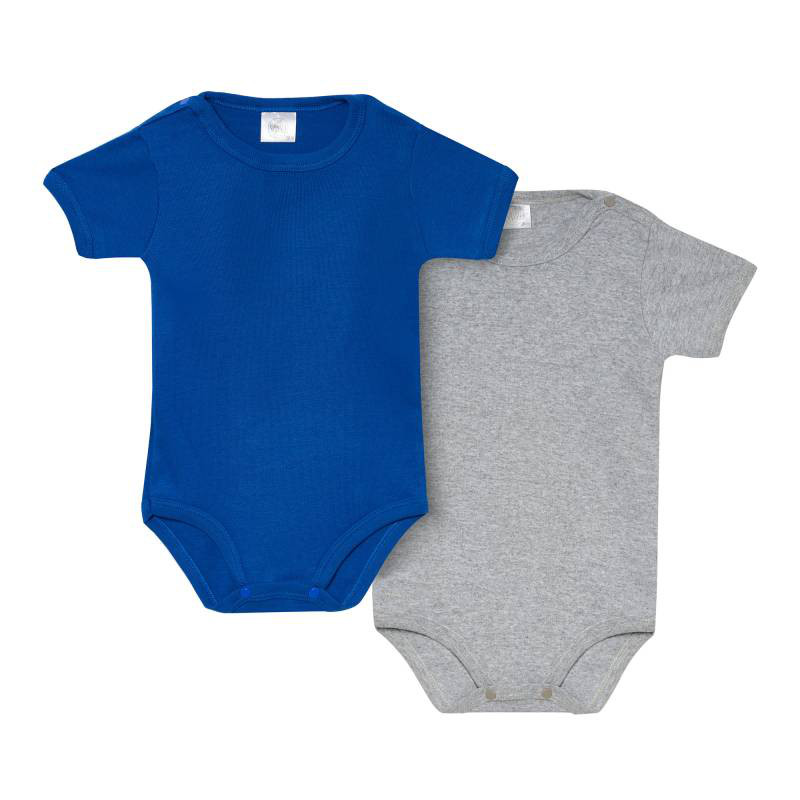 Pack de bodies x2, lisos manga corta, de algodón super suave, colores azul y gris, con abertura debajo con broches plásticos.