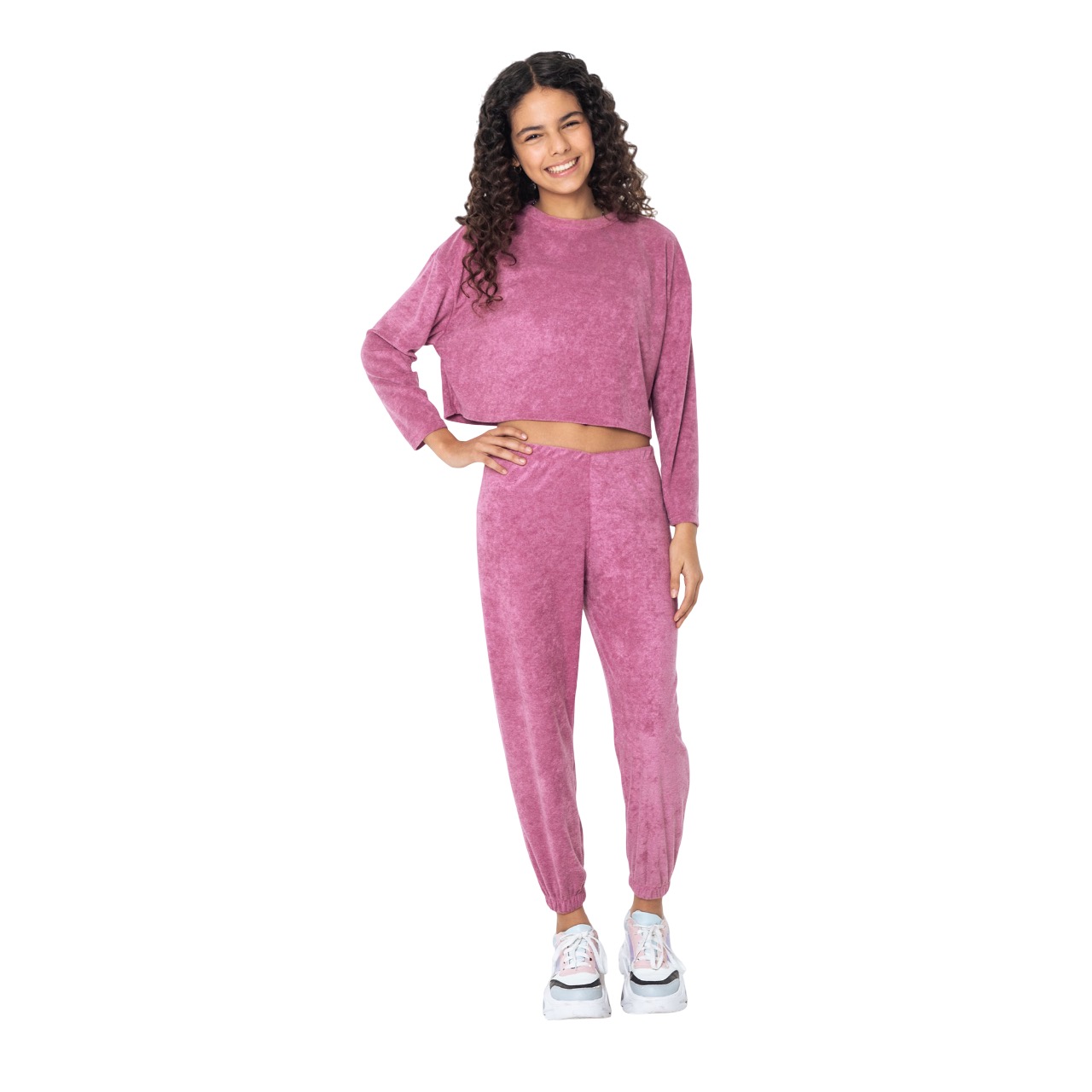 Buzo teen de tela towel largo a la cintura cuello redondo con puños