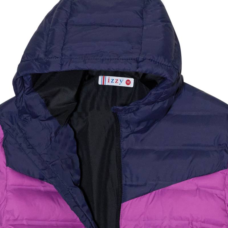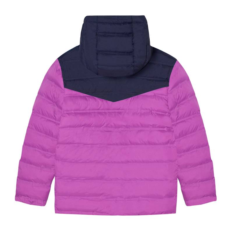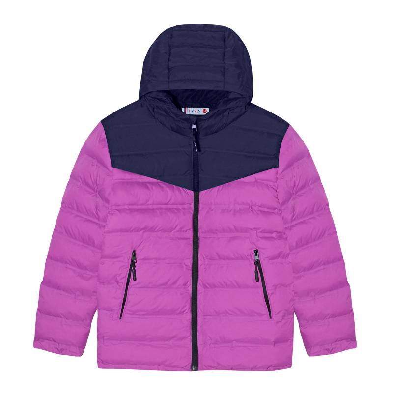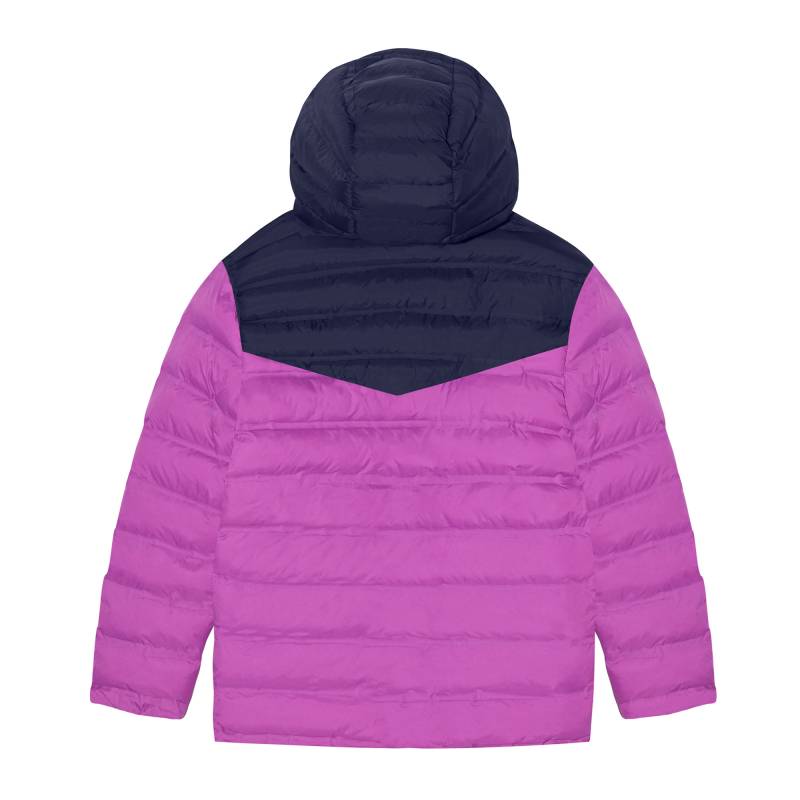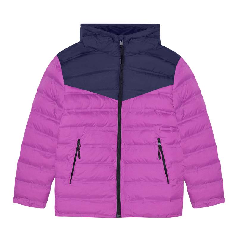 Campera de abrigo juvenil con capucha. Matelaseada con bastones combinada en dos colores donde predomina el color orquidea combinado con azul marino. Liviana con relleno de vellón siliconado. Bolsillos con cierre.