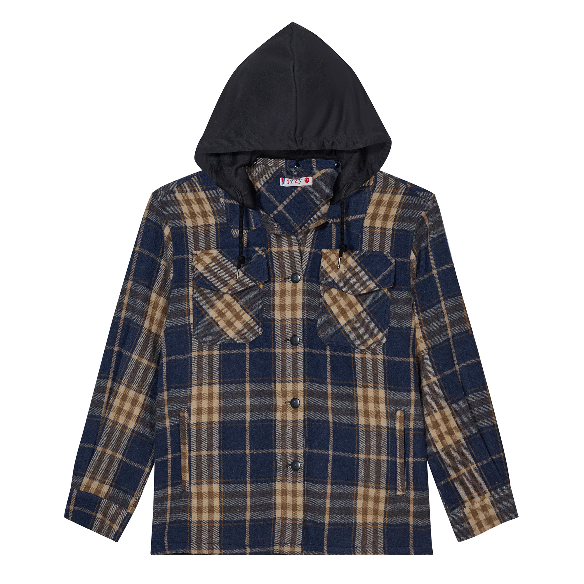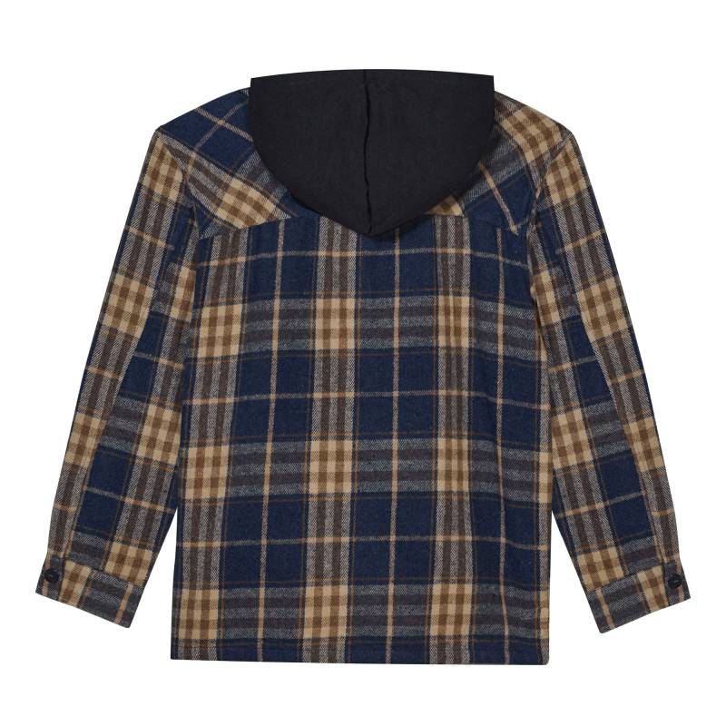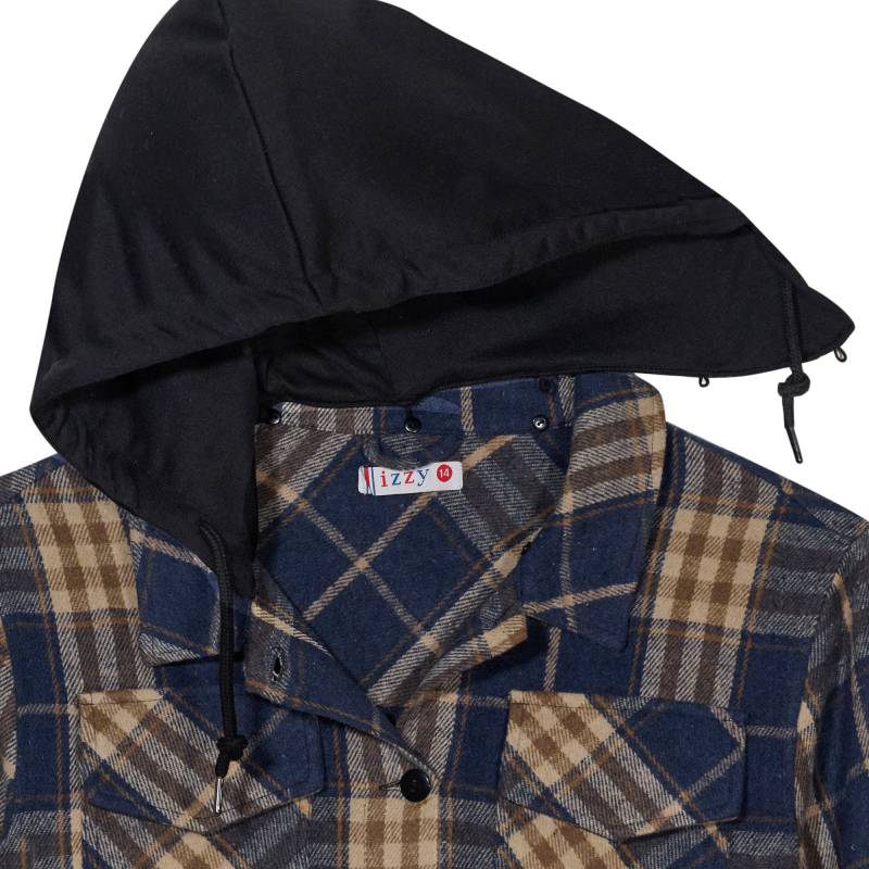 Camisaco juvenil cuadrille color azul y beige con botones y dos bolsillos con solapa al frente. Capucha color negra desmontable.