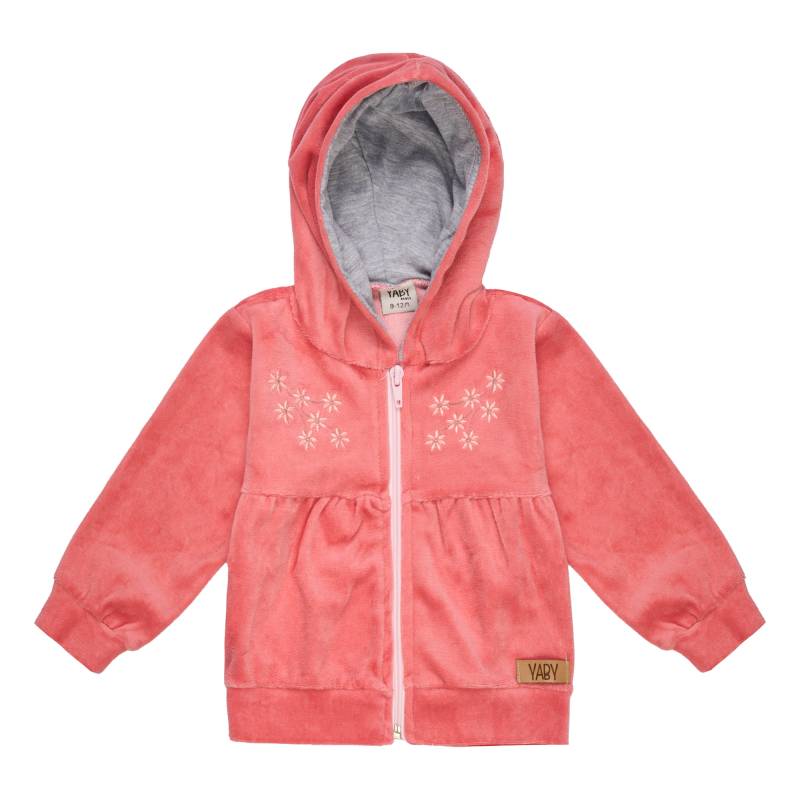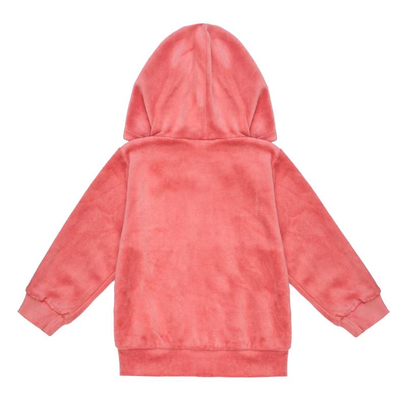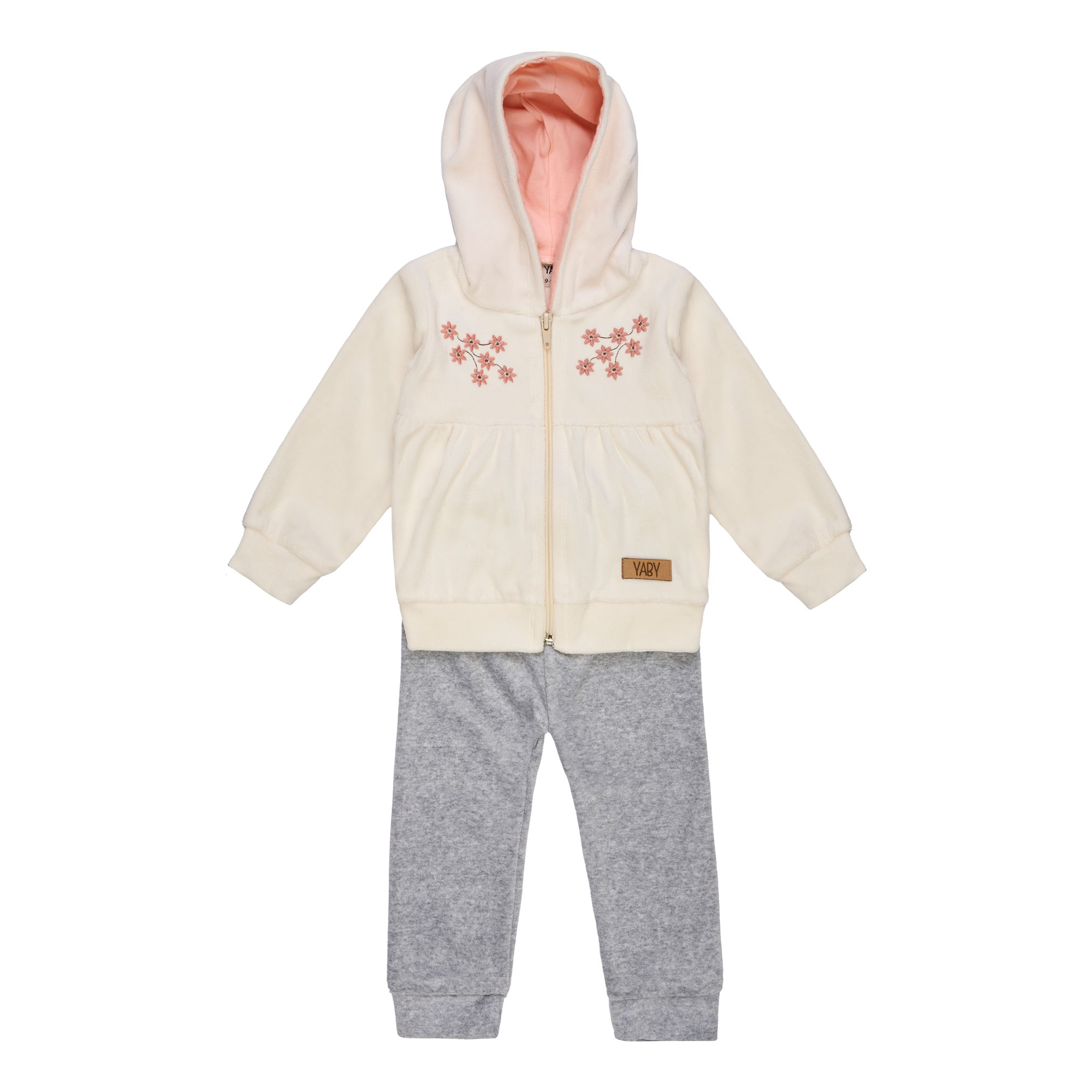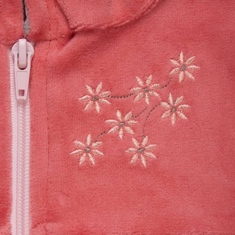 Conjunto beba campera y pantalón de plush liso con bordado de florcitas. Color rosa