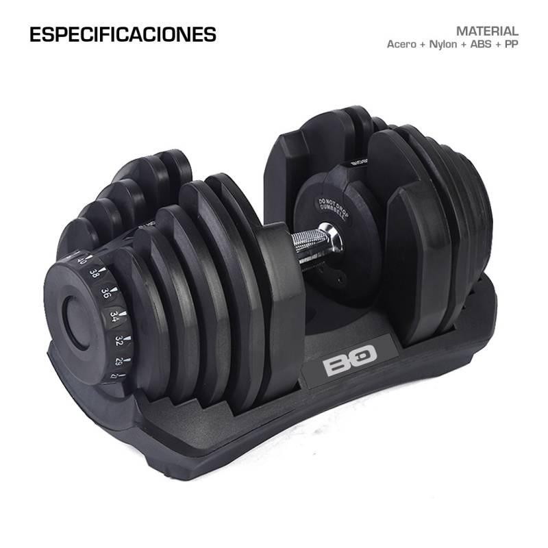 Mancuerna Ajustable Biosports 40 Kg Características Principales: - Ajuste de Peso Versátil: La mancuerna se ajusta entre 5KG y 40KG en 17 incrementos diferentes, ofreciendo la flexibilidad necesaria para personalizar tu rutina de ejercicios. - Fácil de Usar: Cambia el peso en segundos con un simple giro del dial, facilitando ajustes rápidos y eficientes durante tus entrenamientos. - Material de Alta Calidad: Fabricada con acero y PVC de alta resistencia, esta mancuerna es duradera y garantiza un rendimiento óptimo en cada uso. - Discos y Base Recubiertos: Los discos y la base están recubiertos para evitar rayar los pisos, asegurando que tu espacio de entrenamiento se mantenga en perfectas condiciones. - Maximización del Espacio: Esta mancuerna elimina la necesidad de 17 pares de mancuernas, maximizando tu espacio de entrenamiento y proporcionando una solución compacta y eficiente.