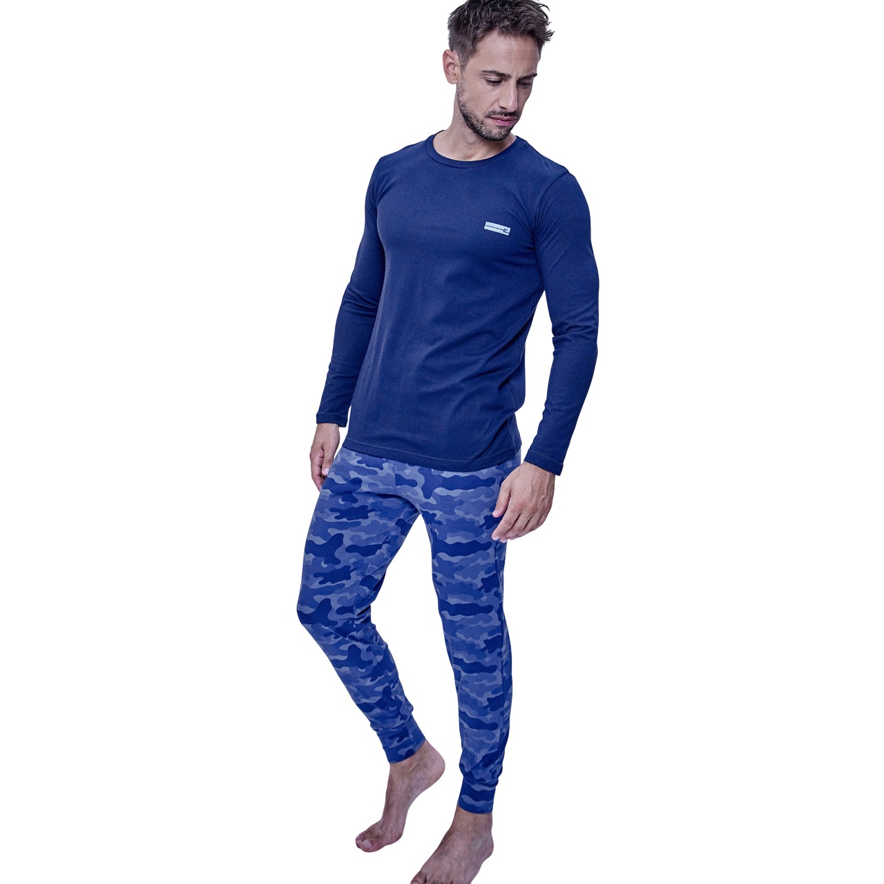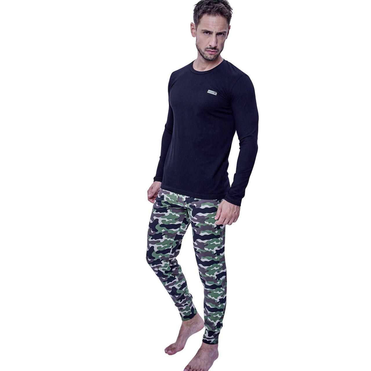 Pijama de hombre con remera lisa con logo estampado y pantalón con estampa camuflado. 100% Algodón.