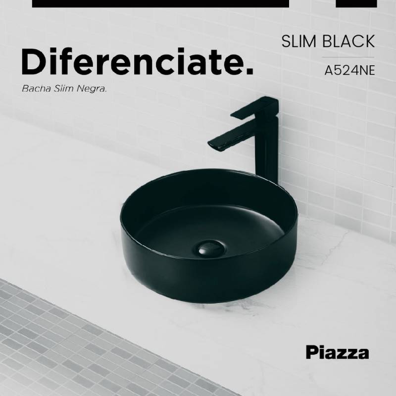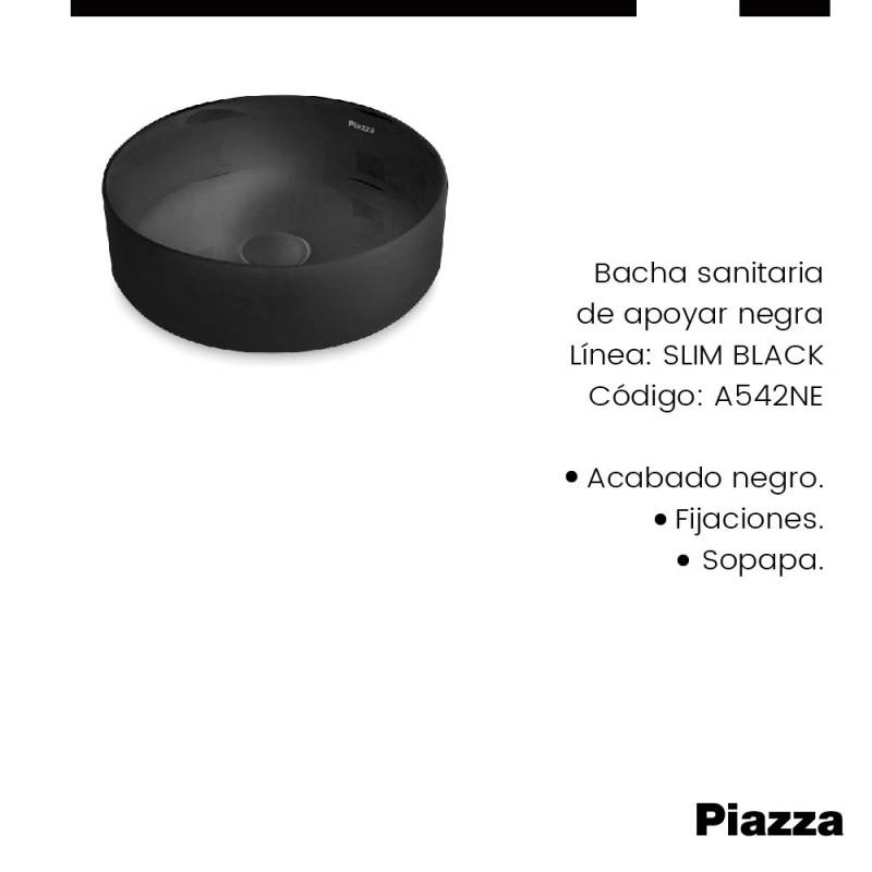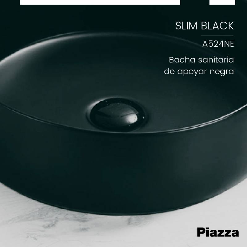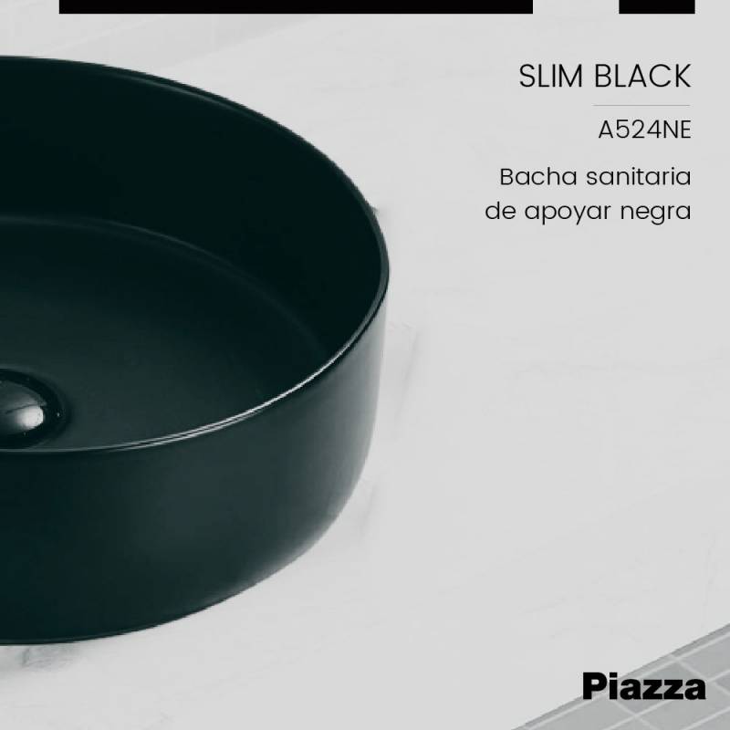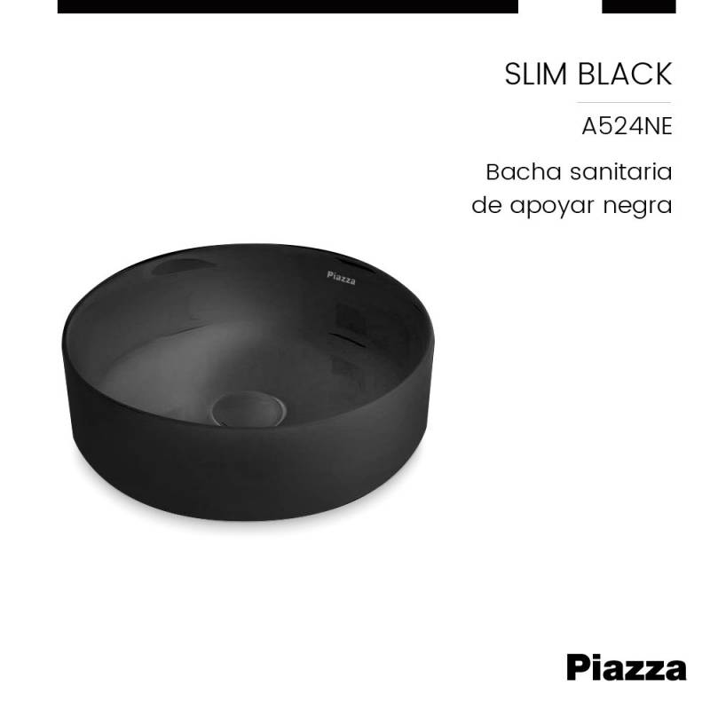Bacha Sanitaria de Apoyar Redonda Negra Piazza Slim (A524NE) Se puede combinar con SL400NE (Descarga de sifon para Lavatorio) Innovación en griferías de alta calidad, diseño y tecnología No incluye Fijaciones No incluye Sopapa