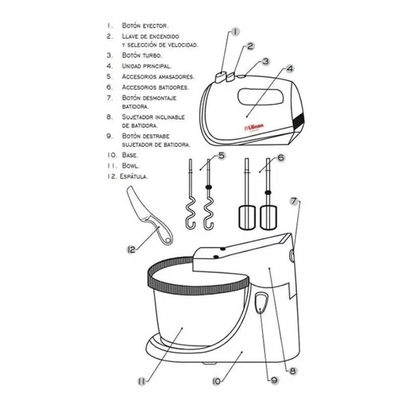 Accesorios: Batidores metálicos, amasadores metálicos y espátula plástica