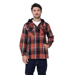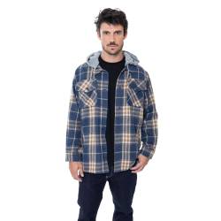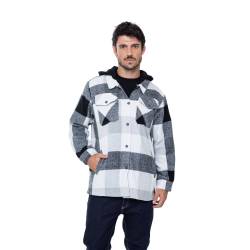 Camisaco de hombre de abrigo con botones en el acceso frontal. Tiene 2 bolsillos con solapa en frente. También tiene capucha en frisa con cordones para ajustar.
