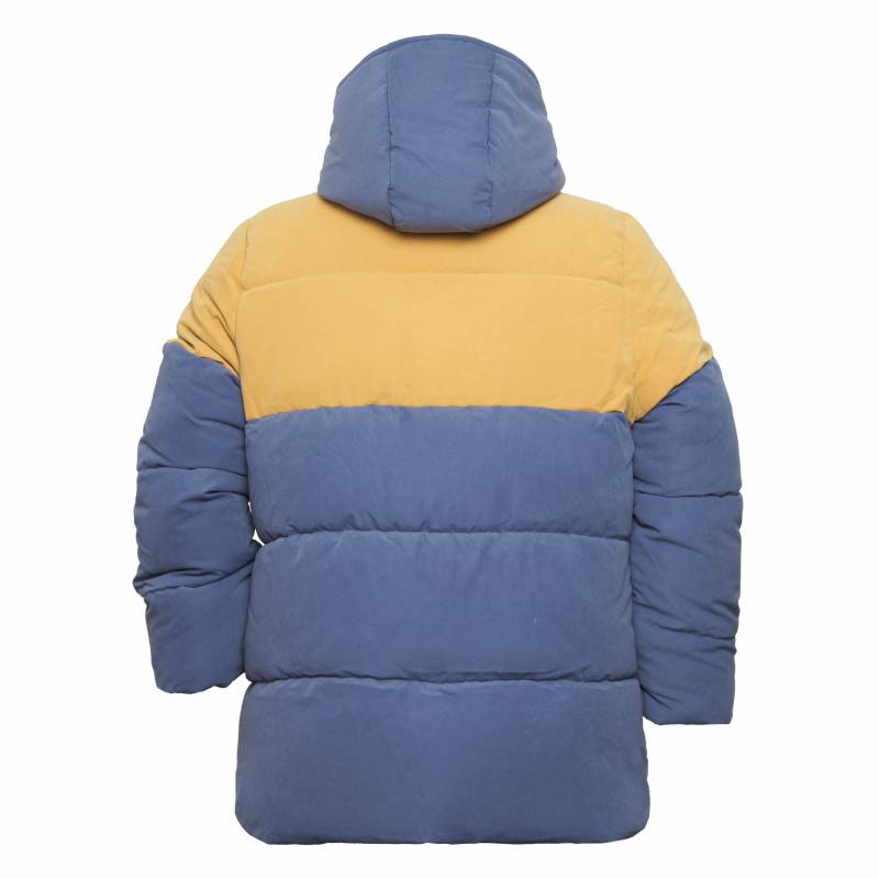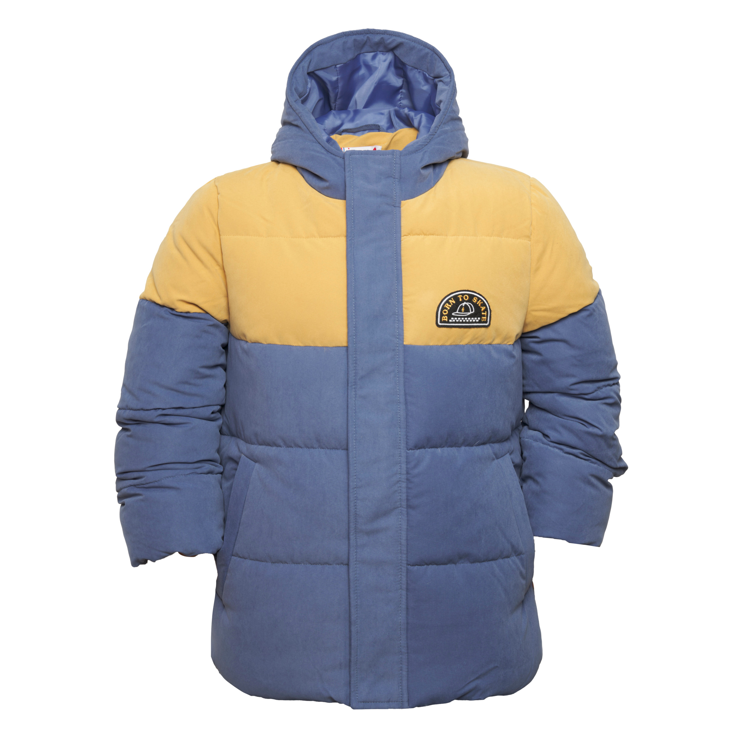 Campera juvenil de abrigo con capucha combinada azul/mostaza. Cierre y botones.