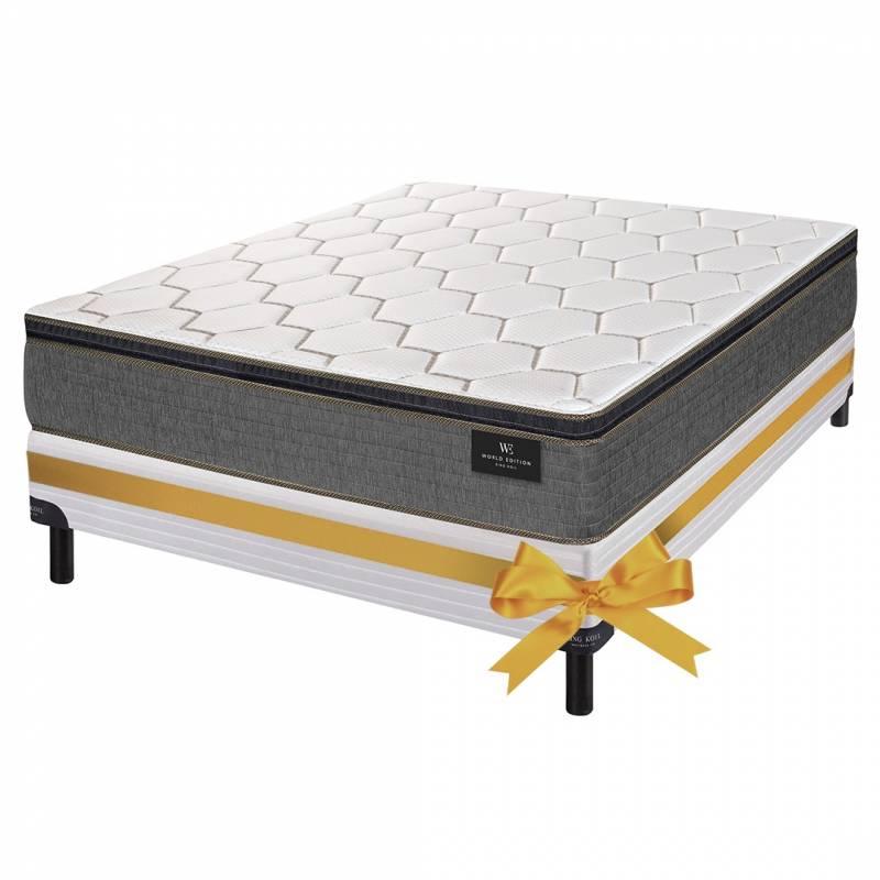 Características adicionales: Incluye una base de sommier revestida en tejido jacquard, que complementa el diseño del colchón con un acabado elegante y resistente. Su estructura sólida y patas metálicas aseguran una base estable y duradera, ideal para todo tipo de dormitorios.
