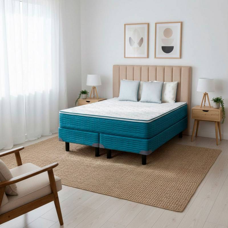 El conjunto de colchón y sommier de una plaza Horus Blue combina el sistema clásico de resortes con espumas premium para brindar el soporte que necesitás.
