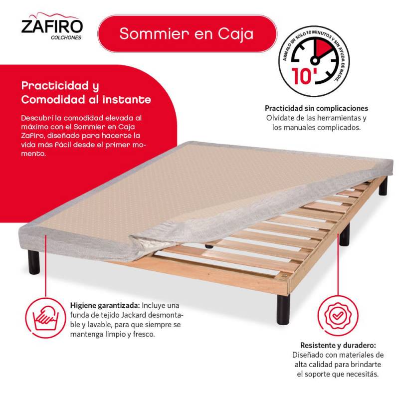Incluye base sommier en caja, de armado simple y sin herramientas, con estructura firme que brinda soporte duradero. Su funda de tela Jackard desmontable y lavable facilita el mantenimiento, ayudando a conservar el sommier en excelentes condiciones a lo largo del tiempo.