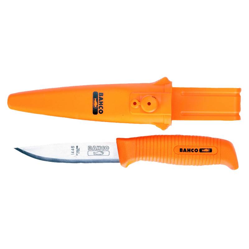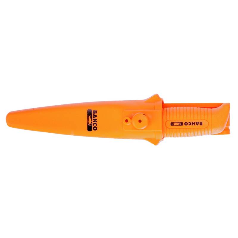 El cuchillo Mango Monocomponente Bahco y funda del mismo material que la empuñadura es de buena calidad, buen filo y muy practico para actividad al aire libre, destacándose por su color naranja
