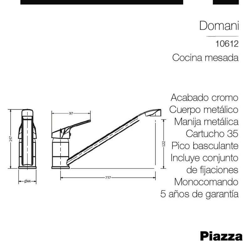 Grifería Cocina Monocomando Mesada Piazza Domani Canilla (10612) ¡Viví Piazza! -Marca: Piazza -Modelo: Domani -Color: Cromo -Material volante: Metálico -Material del pico: Metálico -Material cuadro: Latón -Tipo de cartucho: Ø 35 mm -Excelente Cromado -Mecanismo Metálico -Presión Mínima: 0,4 kg/cm2 -Tipo de cierre: Monocomando -Fácil Instalación: Incluye flexibles y fijaciones para instalación -Pico recto con filtro aireador -Apto para calefón y/o termotanque -Garantía: 5 años Oficial de Fábrica ¡SUSTENTABILIDAD! - AGUA ES VIDA! Desde Piazza cuidamos el medioambiente con distintos protocolos presentes en nuestros productos. > Cartucho Doble Step > Cocinas Se utiliza en los Monocomandos y cuenta con 2 posiciones en la apertura al paso de agua lo que permite hasta un 45% de ahorro de agua.