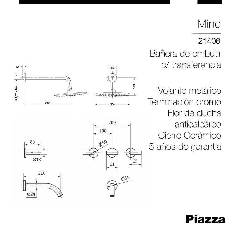 Grifería Ducha Embutir Piazza Mind C/ Transf Cierre Cerámico (21406): ¡Viví Piazza! - Marca: Piazza - Modelo: Mind - Embutir - Con Transferencia - Flor de ducha anticalcáreo Ancho - Aireador Metálico - Color: Cromo - Forma Volante: Lever - Material volante: Metálico - Material campana: ABS Cromado - Material del pico: Metálico - Material cuadro y vástago: Latón - Excelente Cromado - Mecanismo Metálico - Presión Mínima: 0,4 kg/cm2 - Tipo de cierre: Cerámico - Garantía: 5 años Oficial de Fábrica - Apto para calefón y/o termotanque ¡SUSTENTABILIDAD! - AGUA ES VIDA! Desde Piazza cuidamos el medioambiente con distintos protocolos presentes en nuestros productos. > Flexible Monocomando > Los flexibles de Monocomando están fabricados con juntas y tubo interior en caucho EPDM. Además cumplen con todas las normativas, certificaciones y controles de calidad otorgando una garantía de producto de excelencia. INNOVACIÓN EN GRIFERÍAS DE ALTA CALIDAD, DISEÑO Y TECNOLOGÍA. Somos una empresa nacional con 131 años de trayectoria y experiencia. La más antigua del mercado y la única integral de griferías y sanitarios. Contamos con una planta en el Parque Industrial Pilar de 7 hectáreas con una superficie de 20.000 m2.