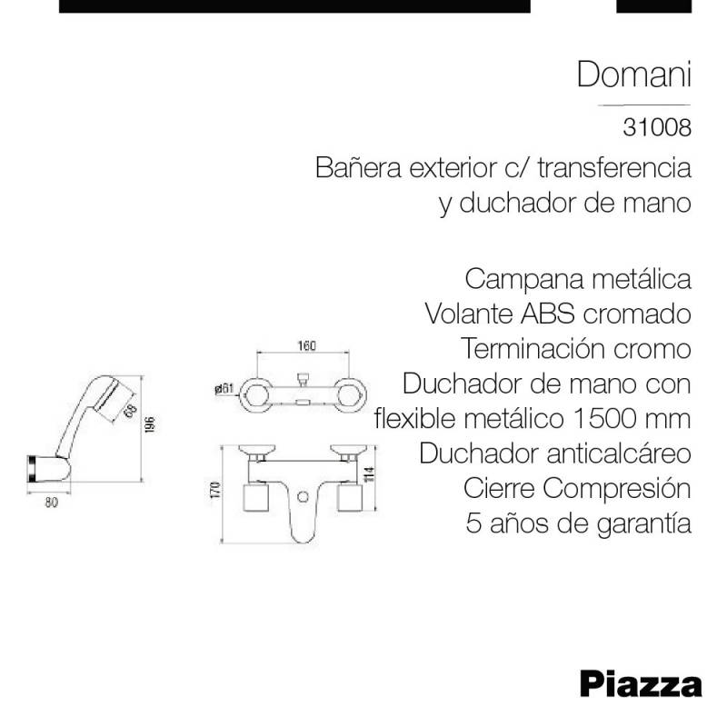 Grifería Ducha Exterior Piazza Domani Baño Duchador Canilla Flor con Transferencia (31008): Simpleza - ¡Viví Piazza! - Marca: Piazza - Modelo: Domani - Color: Cromo - Duchador anticalcáreo - Aireador Metálico - Material volante: ABS Cromado - Material campana: ABS Cromado - Material del pico: Metálico - Material cuadro y vástago: Latón - Excelente Cromado - Mecanismo Metálico - Presión Mínima: 0,4 kg/cm2 - Tipo de cierre: Compresión - Llave: Cilíndrica - Garantía: 5 años Oficial de Fábrica - Apto para calefón y/o termotanque ¡SUSTENTABILIDAD! - AGUA ES VIDA! Desde Piazza cuidamos el medioambiente con distintos protocolos presentes en nuestros productos. > Aireador Espumante > Las griferías cuentan con un aireador con portaboquilla/oculta que permite el ingreso de aire al chorro de agua generando una sensación más placentera en su caudal y ahorrando hasta un 30% de agua. > Flexible Monocomando > Los flexibles de Monocomando están fabricados con juntas y tubo interior en caucho EPDM. Además cumplen con todas las normativas, certificaciones y controles de calidad otorgando una garantía de producto de excelencia. INNOVACIÓN EN GRIFERÍAS DE ALTA CALIDAD, DISEÑO Y TECNOLOGÍA. Somos una empresa nacional con 131 años de trayectoria y experiencia. La más antigua del mercado y la única integral de griferías y sanitarios. Contamos con una planta en el Parque Industrial Pilar de 7 hectáreas con una superficie de 20.000 m2.