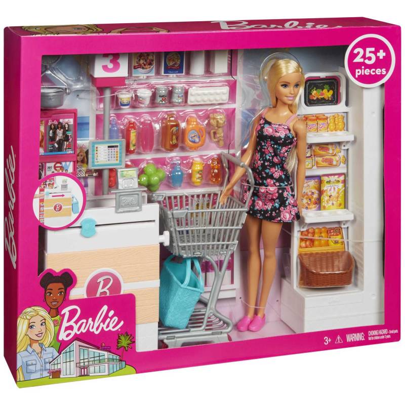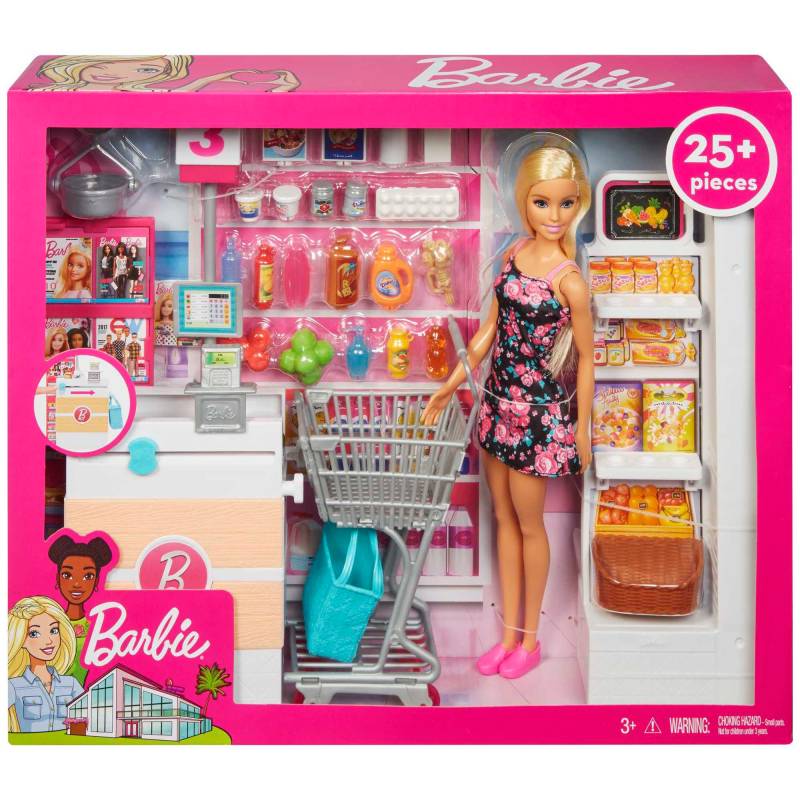Barbie set de juego supermercado con muñeca, carrito, caja registradora y 20 accesorios funcionales. Para niñas de 3 años en adelante