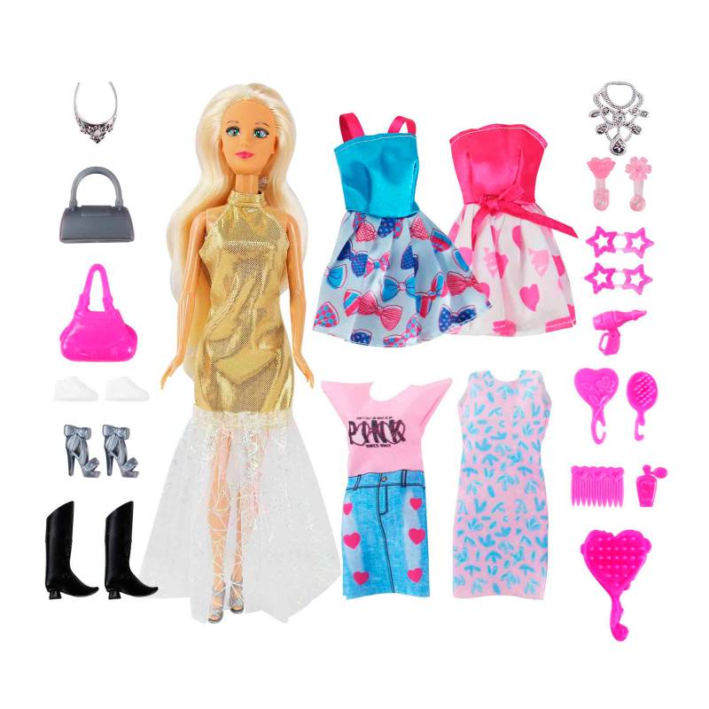 Incluye: 1 corona, 2 bolsos, 2 zapatos adicionales, 1 collar, 4 horquillas, 1 peine, 4 faldas adicionales, accesorios de vestir