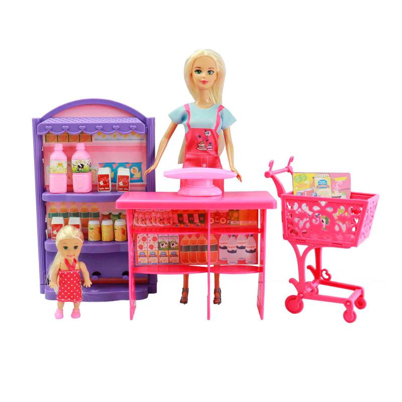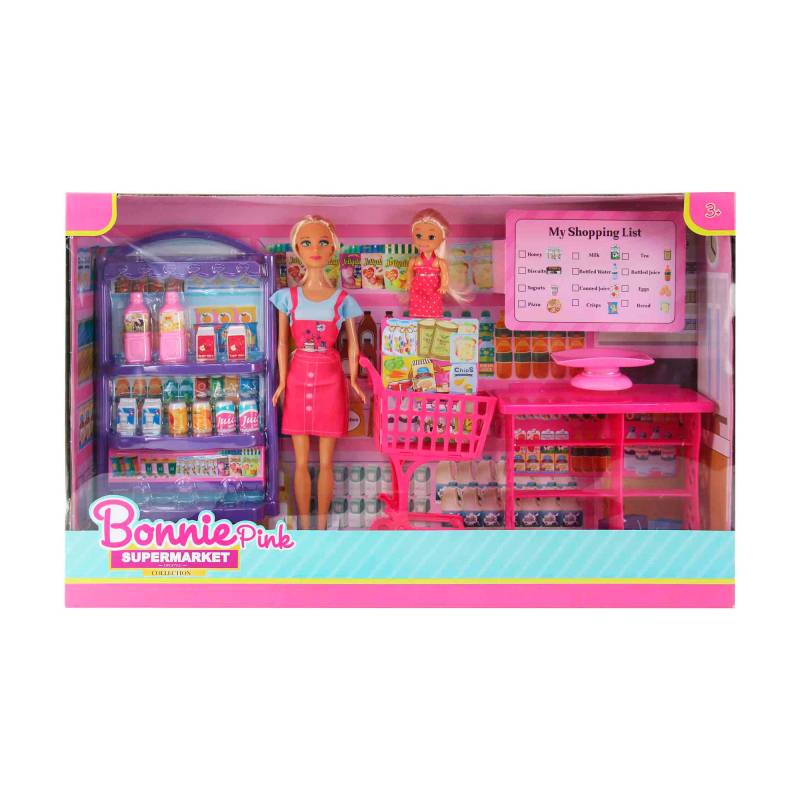 Muñeca Fashion Set Supermercado Bonnie Pink Accesorios: 1 muñeca pequeña; 1 vitrina; 2 botellas de leche; 4 botellas de jugo de naranja; 4 botellas de jugo de manzana; 1 carrito de compras; 1 báscula de baño y 1 mesa