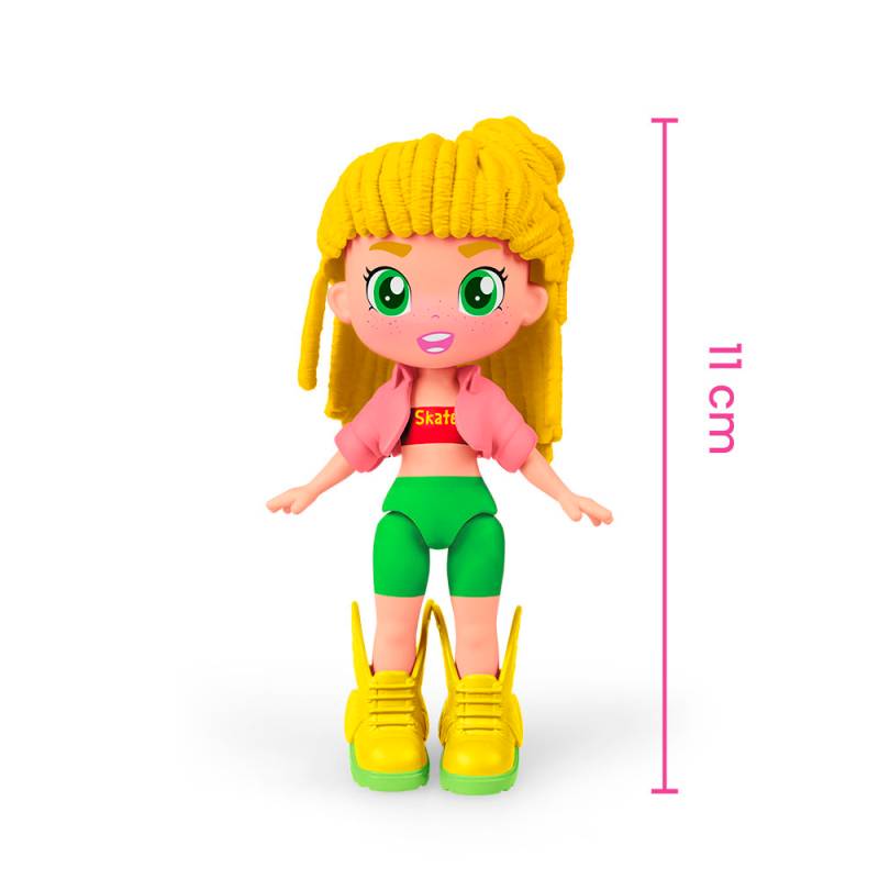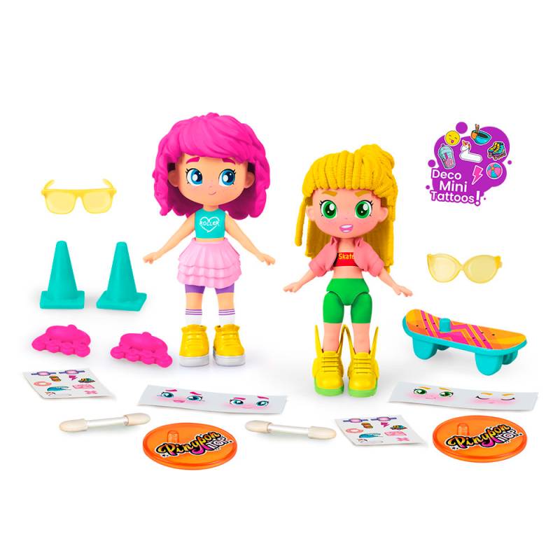 Pinypon TOP Roller Nueva colección 2 Figuras 11 cm. articuladas en brazos y piernas, se intercambian pelo, outfit y zapatos. Ropa blandita y accesorios. Una figura viene con rollers y la otra con skate. Incluye mini tattoos para la cara de la muñeca, ropa y accesorios.