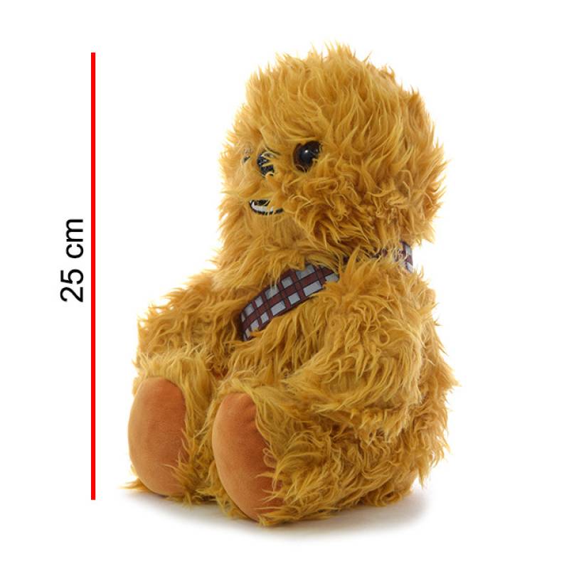Chewbacca, tiene la boca bordada, tiene una cinta con detalles que simulan ser su cinturón, sus ojos son estilo realista y su nariz de plástico, la planta de las patas son de pelo corto y el resto del cuerpo es de pelo largo que simula a la perfeccion la característica del personaje