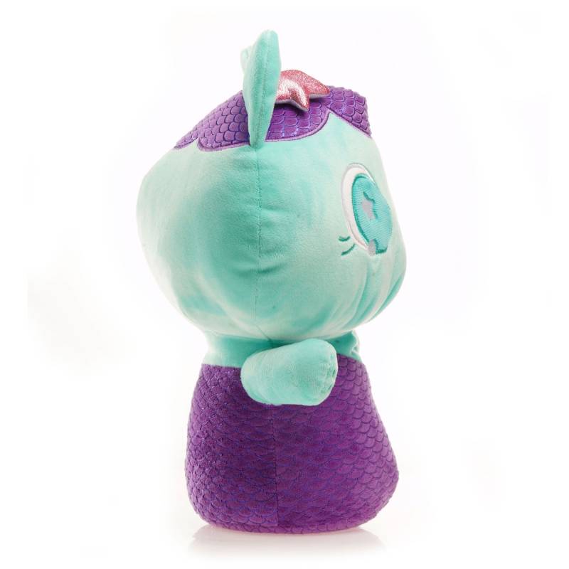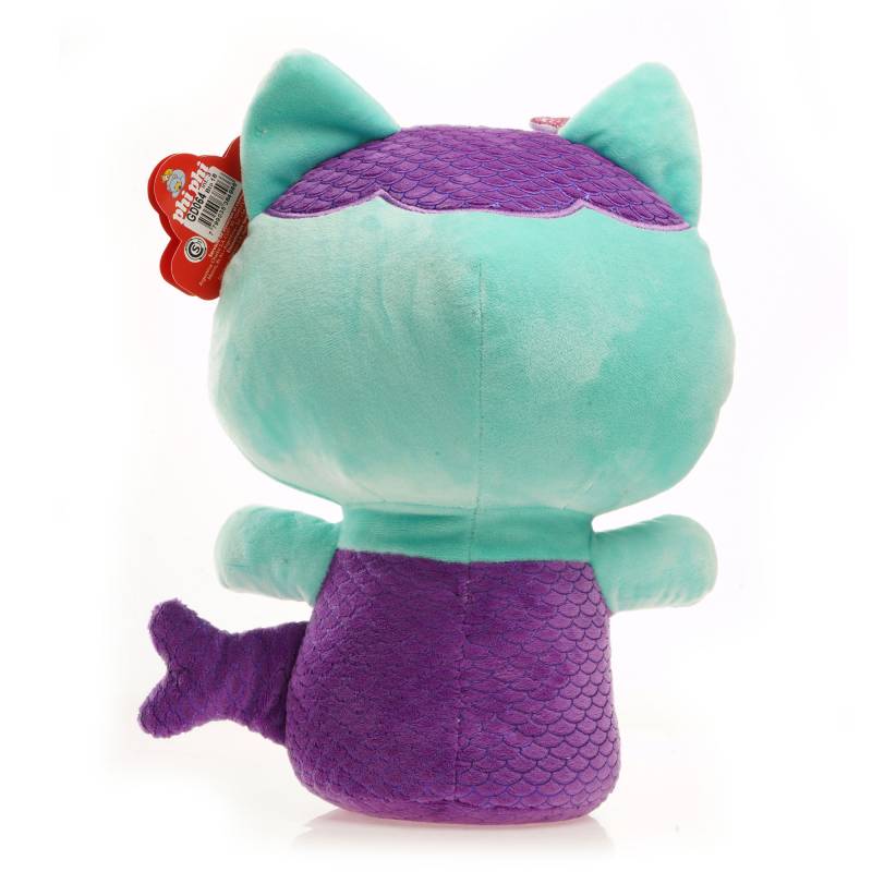 Peluche gato tiene detalles bordados en sus ojos, nariz y mano. Es estilo sirena y tiene una aleta