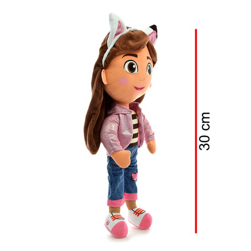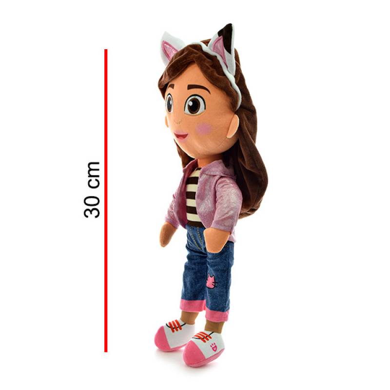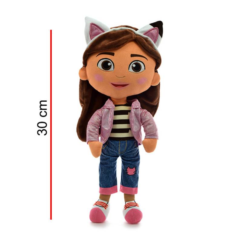 Gabby es un peluche de pelo corto, tiene detalles bordados en sus ojos, nariz y en las orejas de gato. La boca y cejas están impresas. Tiene chaqueta de tela brillosa. Tiene remera, jean y zapatillas impresas