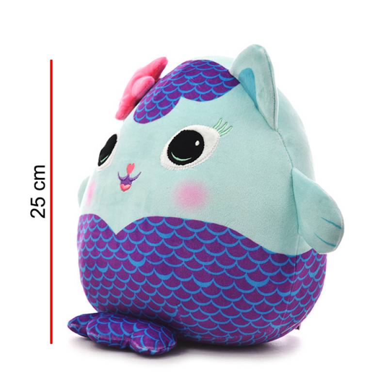 Es un peluche estilo spandex, su tela esta impresa y tiene detalles bordados en sus ojos, nariz y boca. además cuenta con una estrella de mar en la parte superior y una aleta de sirena en su parte inferior