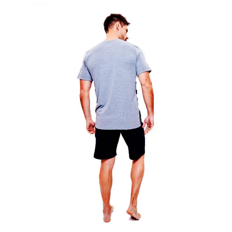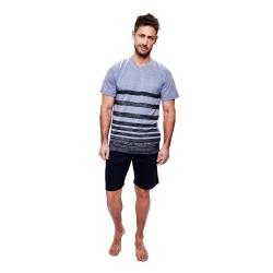 Pijama de hombre combinado, remera manga corta escote V frente estampado a rayas, y pantalón corto liso con bolsillos laterales.Confeccionado en jersey algodón natural. Tejido suave, resistente, duradero e hipoalergénico.