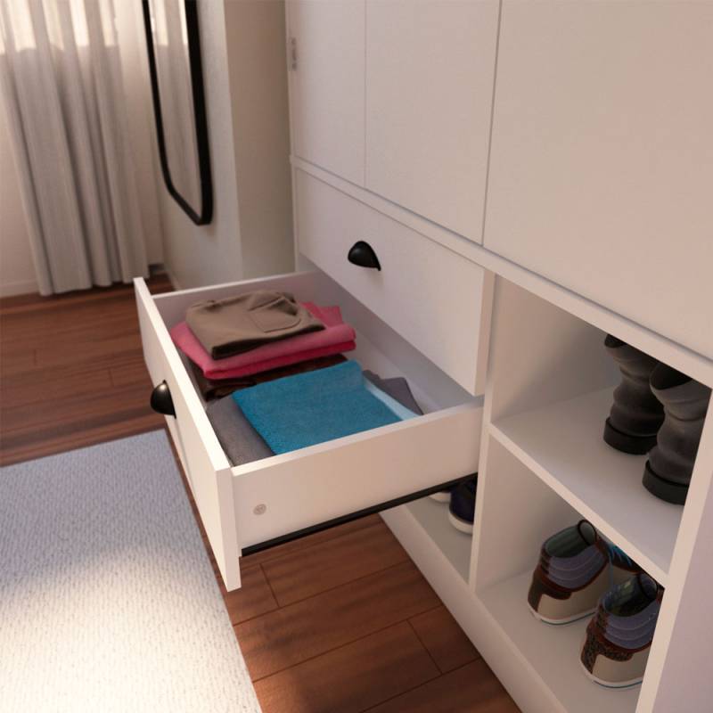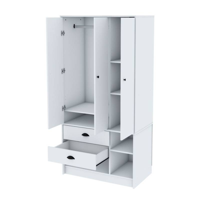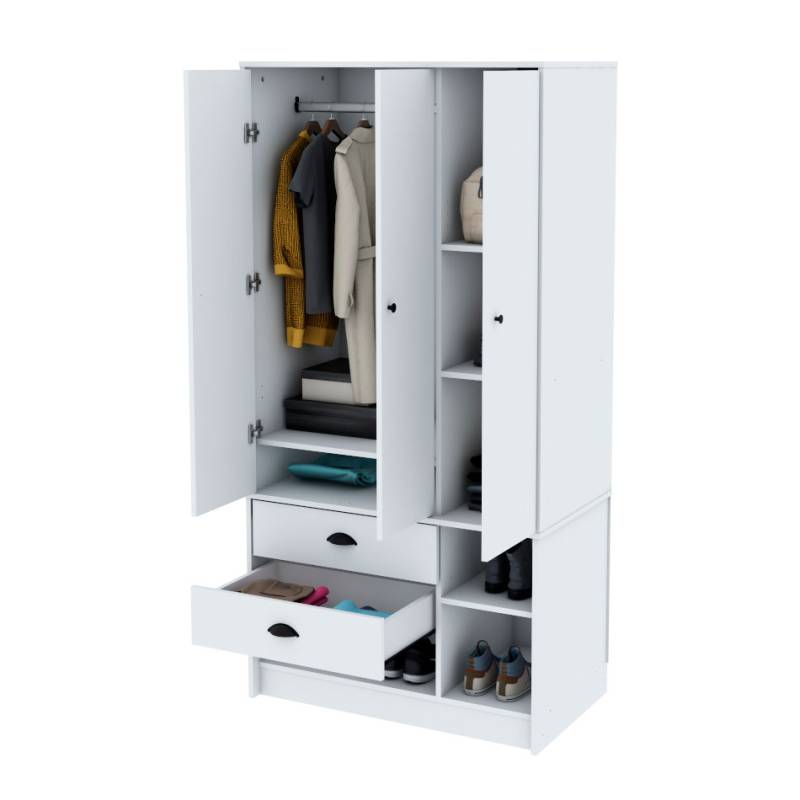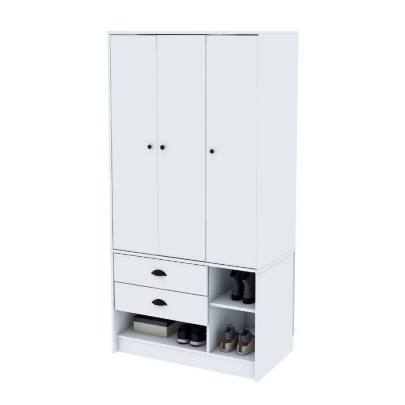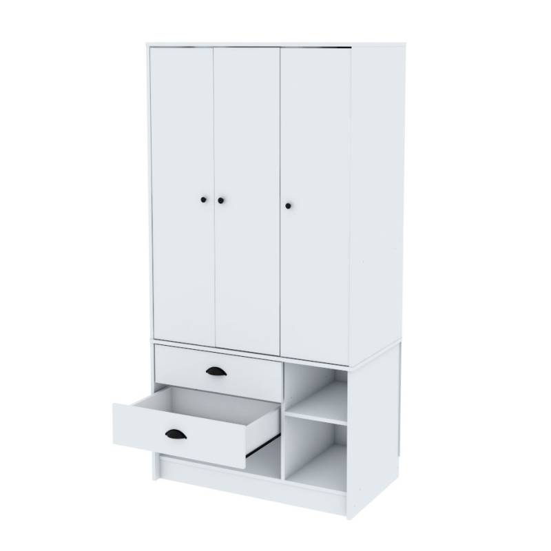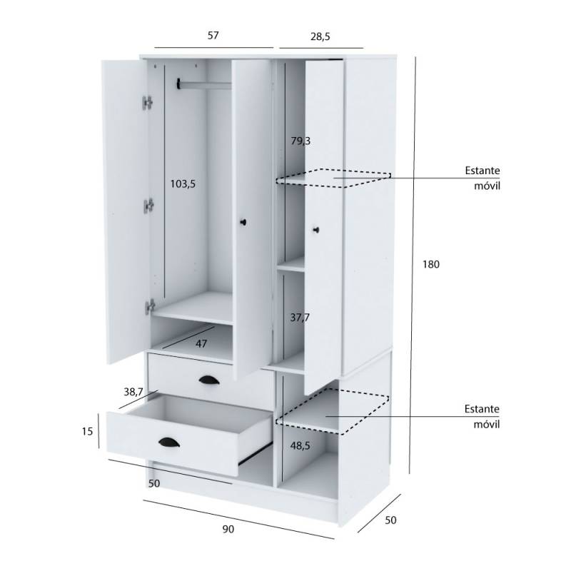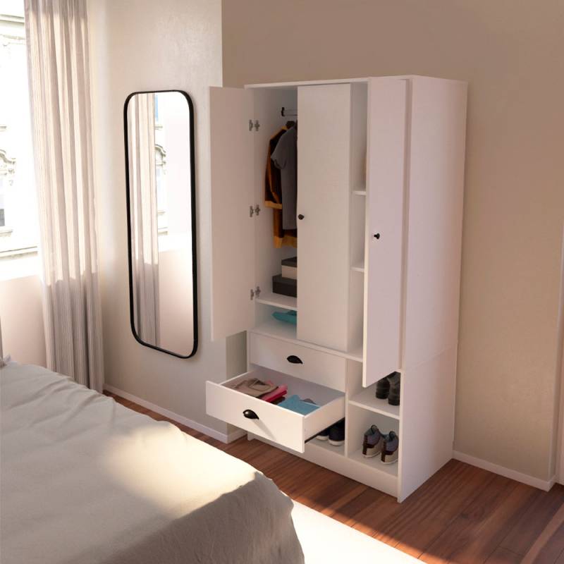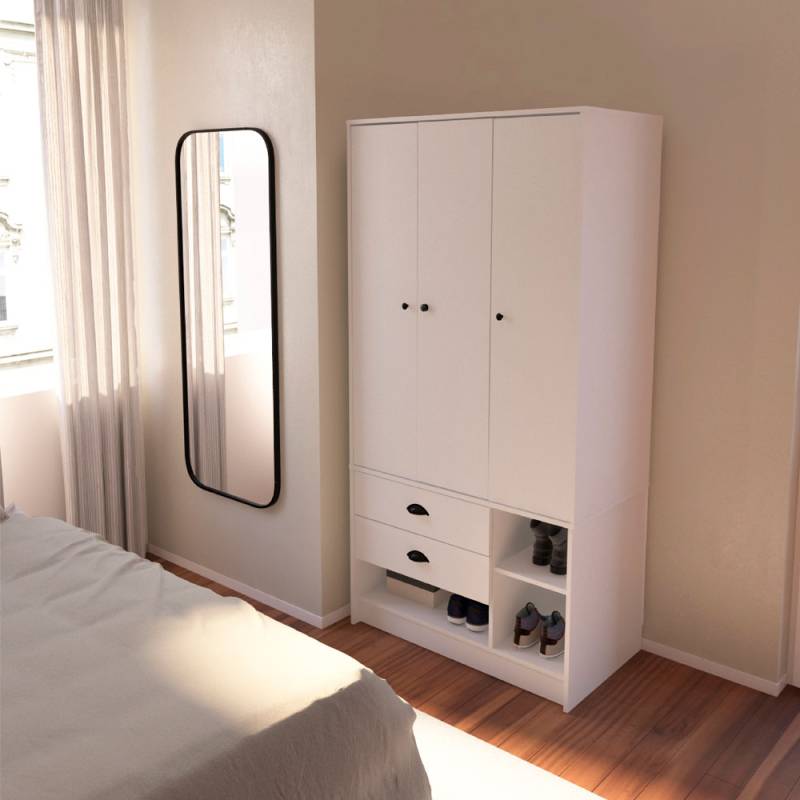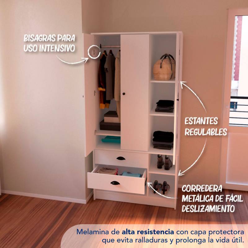 Ropero clásico de tres puertas. Cuenta con dos sección bien definidas, espacio de percheros para colgar tu ropa y estantes regulables para que los coloques de la manera que a vos más te guste. Incluye, además, dos cajones y un compartimento inferior para calzados. Una solución dos en uno: Perchero + estante.