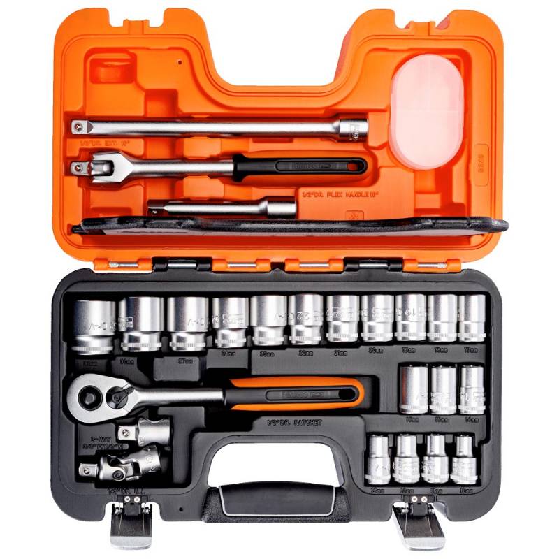 Set bocallaves y accesorios encastre de 1/2" Caja Plástica . 18 Piezas, bocallaves hexagonales de 1/2" 10, 11, 12, 13, 14, 15, 16, 17, 18, 19, 20, 21, 22, 23, 24, 27, 30 y 32 mm. Un crique de 1/2" de liberación rápida, 60 dientes/ángulo de acción de 6°. Dos barras de extensión de 1/2", 5" y 10". Una junta universal de 1/2".. Un adaptador en T de 1/2".. Un mango articulado con dos componentes de 1/2": 10".. Una caja de plástico con tres secciones desmontables y tapa.. Acabado mate.. Aleación de acero de alto rendimiento.. Menos desgaste y daños del tornillo gracias a bocallaves con perfil. Dynamic-Drive.. Botón para extracción rápida del bocallave en el crique.. Caja: Polietileno de alta densidad (HDPE).. Normas: ISO 1174 y DIN 3120.