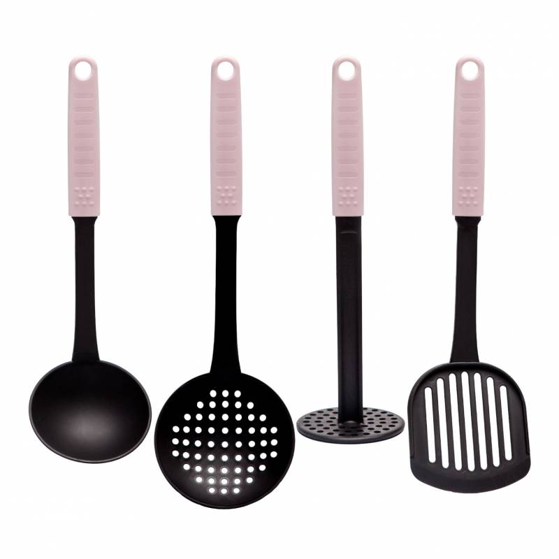 Set de Utensilios de Cocina pensado para utilizar sobre cualquier superficie, incluidas las antiadherentes, con un diseño que posee agarres ergonómicos y antideslizantes, permitiendo una mejor utilización del producto. Incluye Pisapapas, Espátula Ranurada, Espumadera y Cucharón