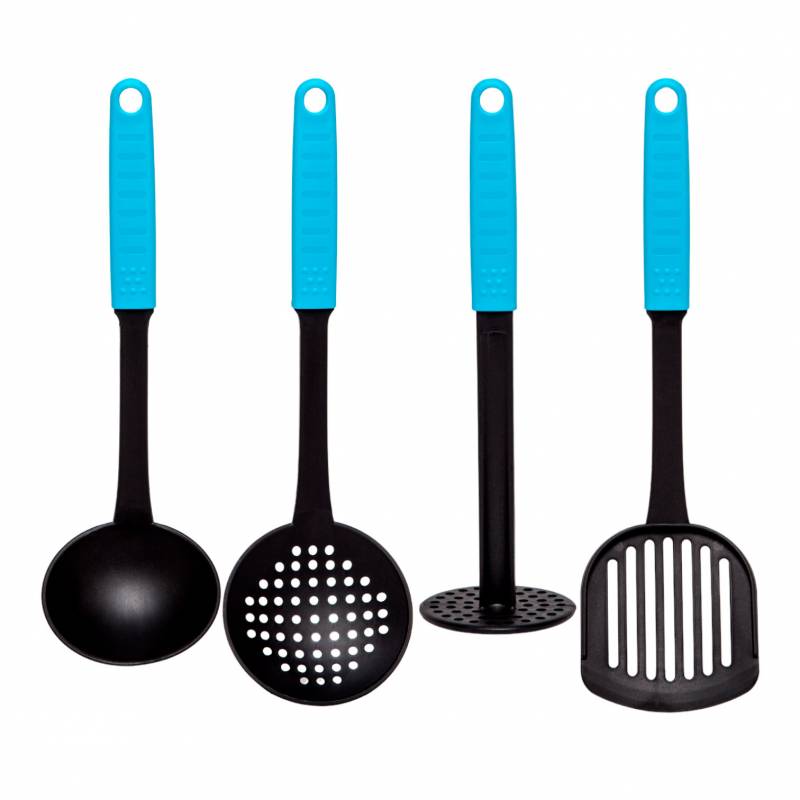 Set de Utensilios de Cocina pensado para utilizar sobre cualquier superficie, incluidas las antiadherentes, con un diseño que posee agarres ergonómicos y antideslizantes, permitiendo una mejor utilización del producto. Incluye Pisapapas, Espátula Ranurada, Espumadera y Cucharón