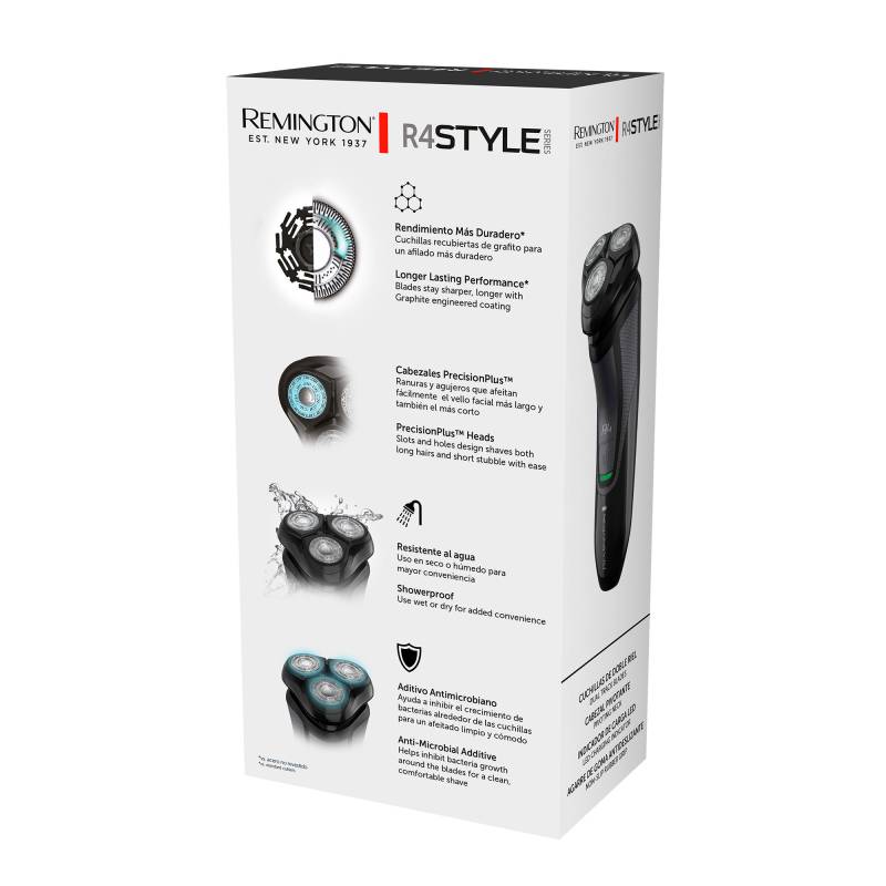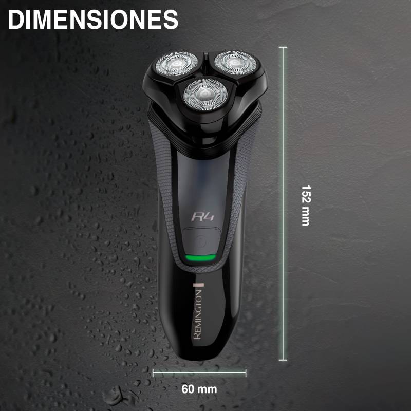 Tu experiencia de afeitado con la Afeitadora Rotativa Remington Style Series R4, R4011 un contacto máximo a la piel. Cuchillas recubiertas de grafito y la tecnología Active Contour garantizan un rendimiento duradero y un máximo contacto con la piel. Disfruta de hasta 50 minutos de uso inalámbrico con una carga USB universal, ideal para cualquier viaje. El cabezal pivotante y la tecnología 360° Power Flex se adaptan a cada contorno de tu rostro. Incluye un accesorio para barba de 3 días, cortador de patillas plegable, es resistente al agua y cuenta con 2 años de garantía.