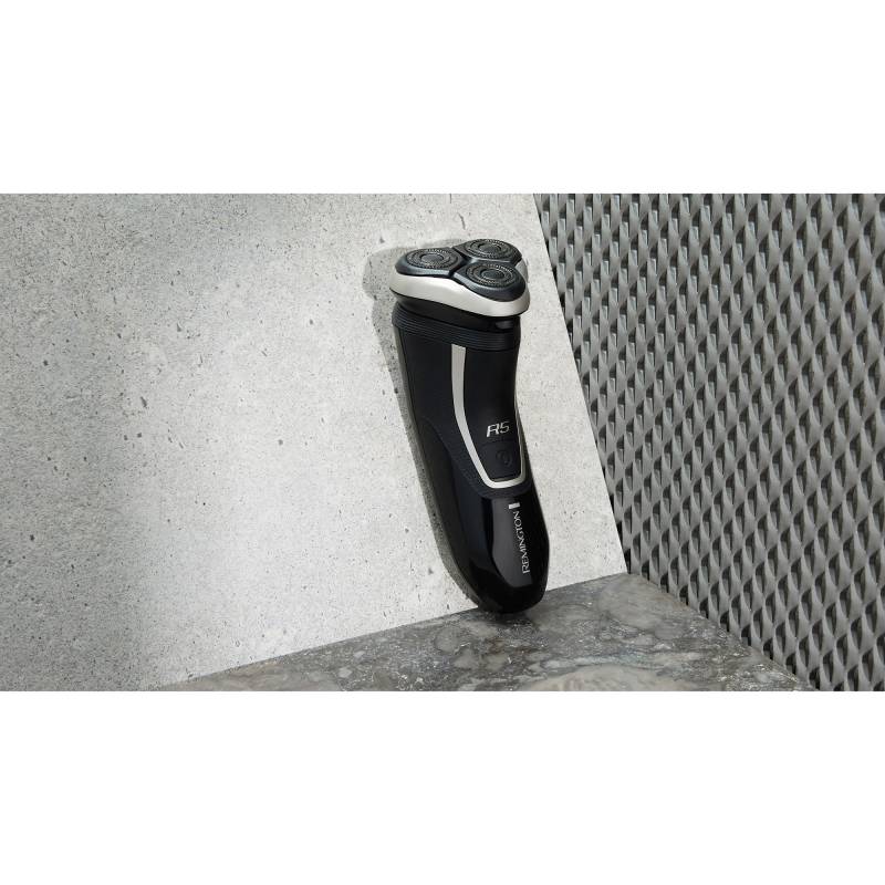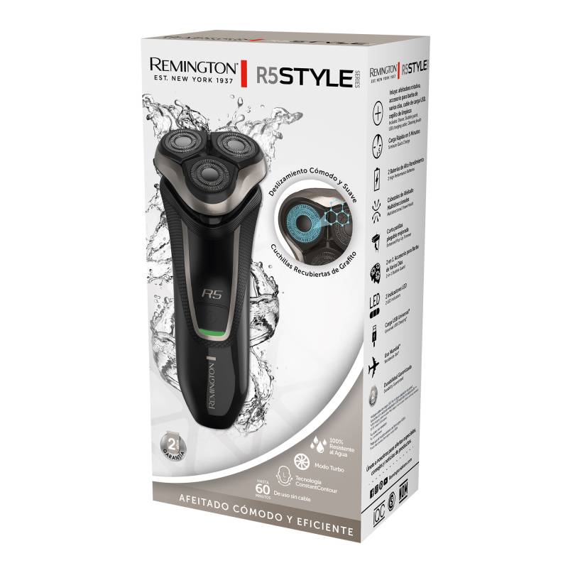 Mejora tu rutina de afeitado con la Afeitadora Rotativa Remington Style Series R5, R5011. Sus cortadores recubiertos de grafito y la tecnología Active Contour aseguran un deslizamiento suave y sin irritación. Con 2 velocidades y modo Turbo, ofrece un afeitado eficiente y cómodo. Disfruta de hasta 60 minutos de uso inalámbrico y una carga rápida de 5 minutos. Es 100% resistente al agua, perfecta para usar en seco o húmedo. Incluye cabezales PrecisionPlus?, aditivo antimicrobiano y accesorio para barba de 3 días. Garantía de 2 años.