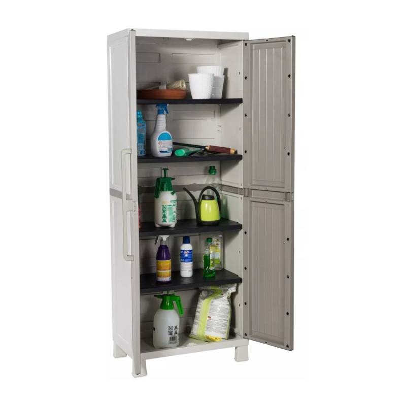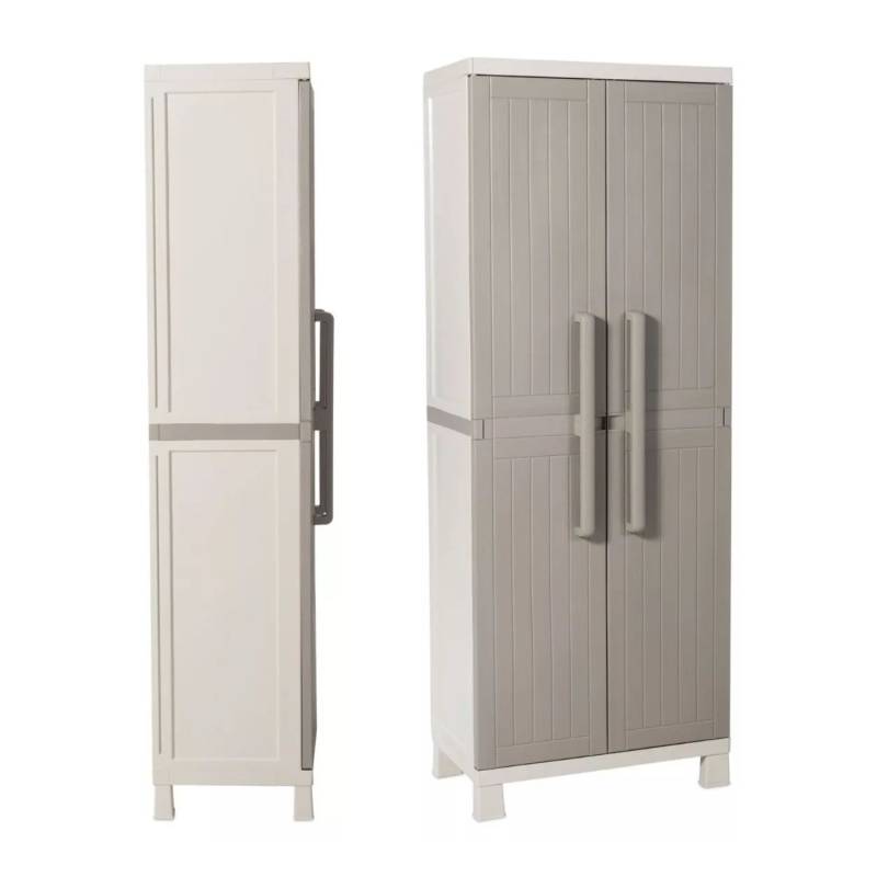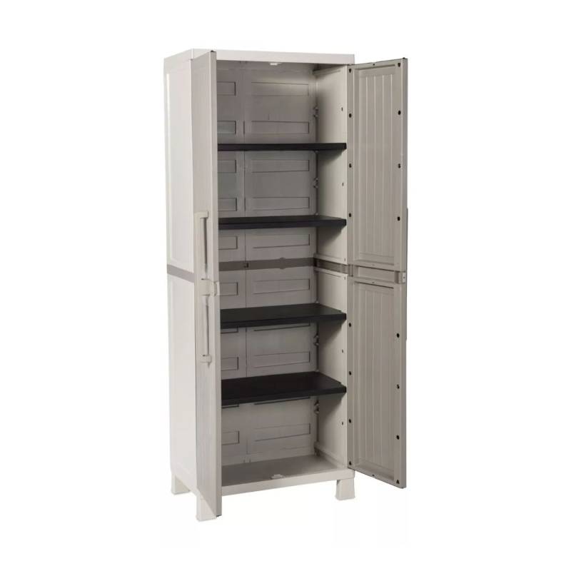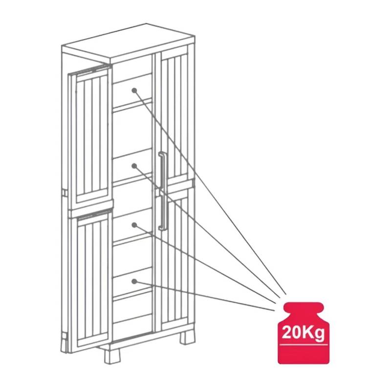 DEPOSITO TOOMAX EXTERIOR/JARDIN WOOD MIDI 65X37X173CM -26819 MEDIDA EXTERNA: 65x37x173 cm MEDIDA INTERNA: 26x15x68 cm -Material: polipropileno, material reciclable y eco-sostenible. Está equipado con bisagras resistentes, estantes ajustables y espacio escobero. -Ideal para interiores y exteriores, balcones, galerías y garage. -No absorbe olores ni humedad. -El producto viene desarmado, el armado es muy sencillo, incluye instrucciones y tornillos. -Peso máximo que soporta cada estante 15 kg
