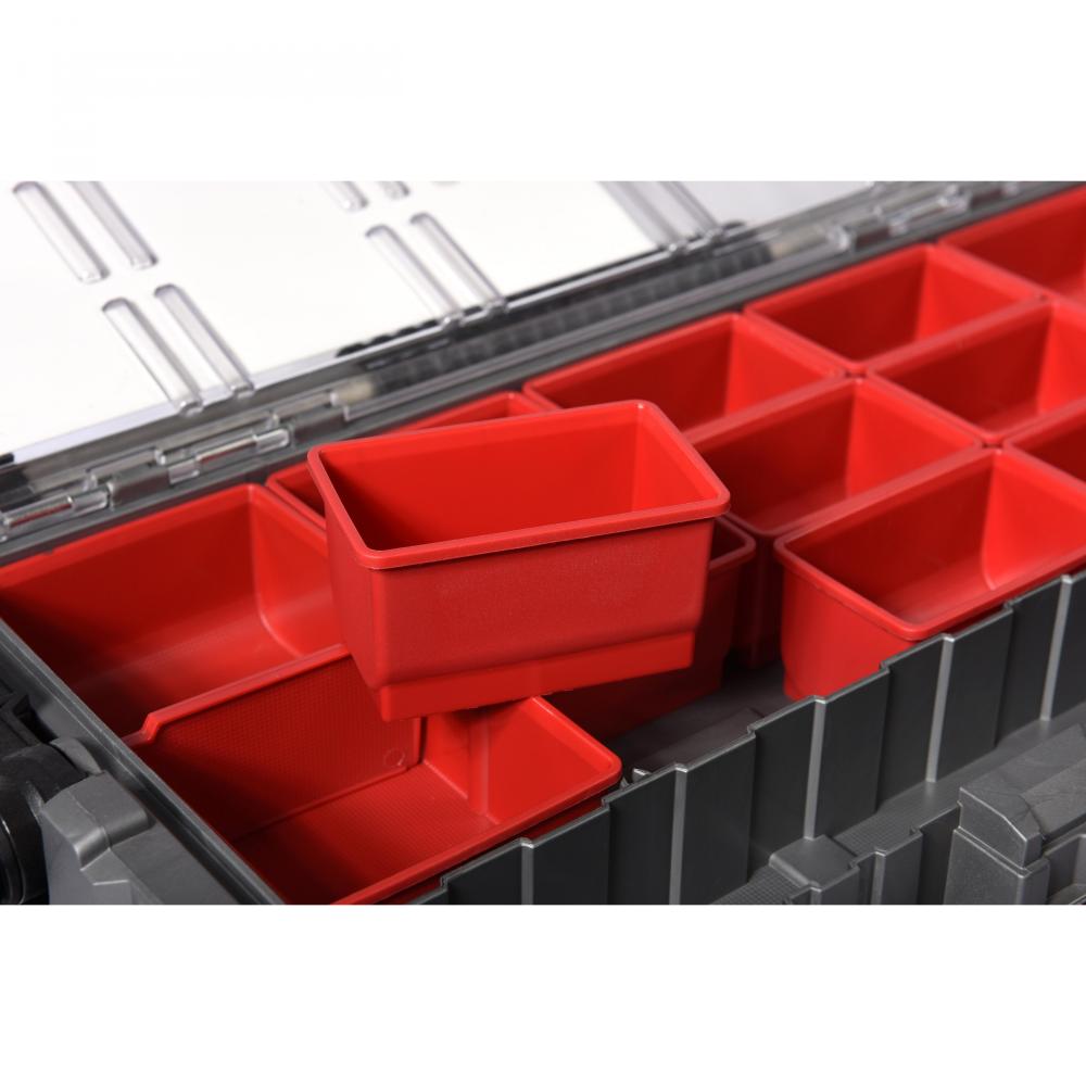 - Los contenedores extraíbles de varios tamaños permiten una organización eficiente de herramientas y piezas pequeñas