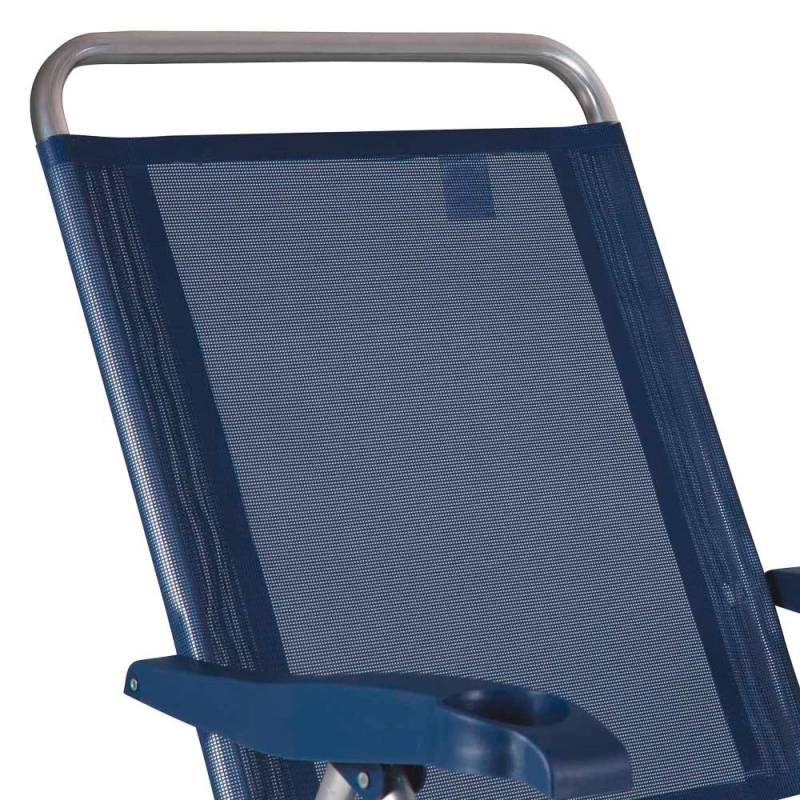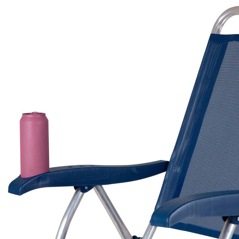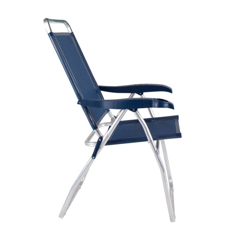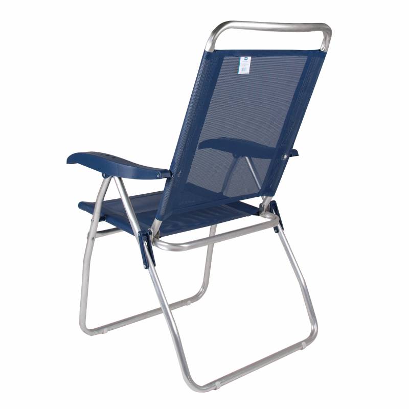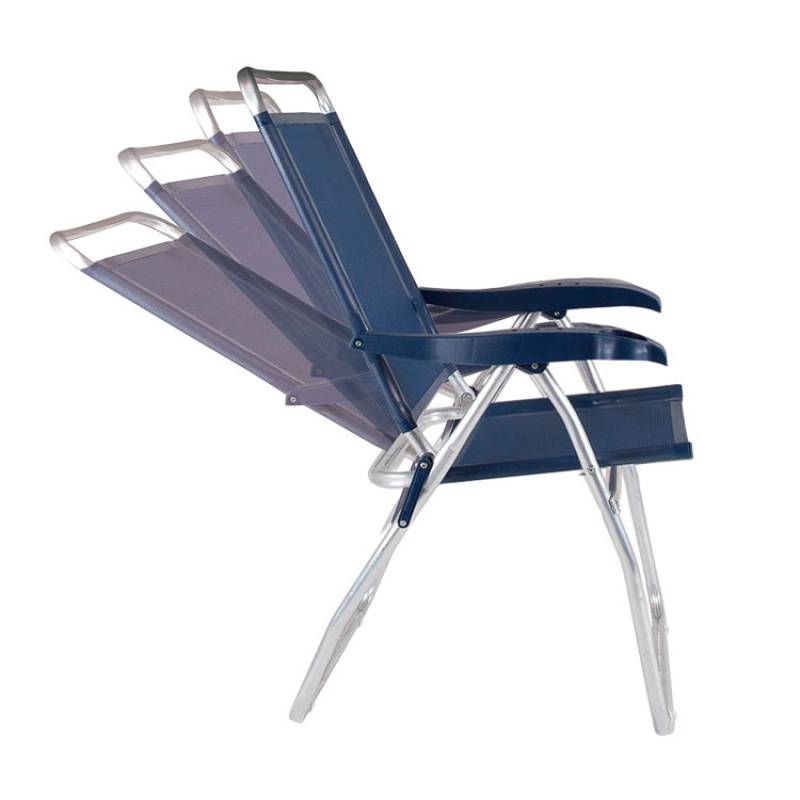 Silla Reclinable 4 Posiciones de Aluminio. Posee respaldo alto y ancho, además de ser ligera y resistente. Posee tela fácil de limpiar y soporta hasta 110Kg.