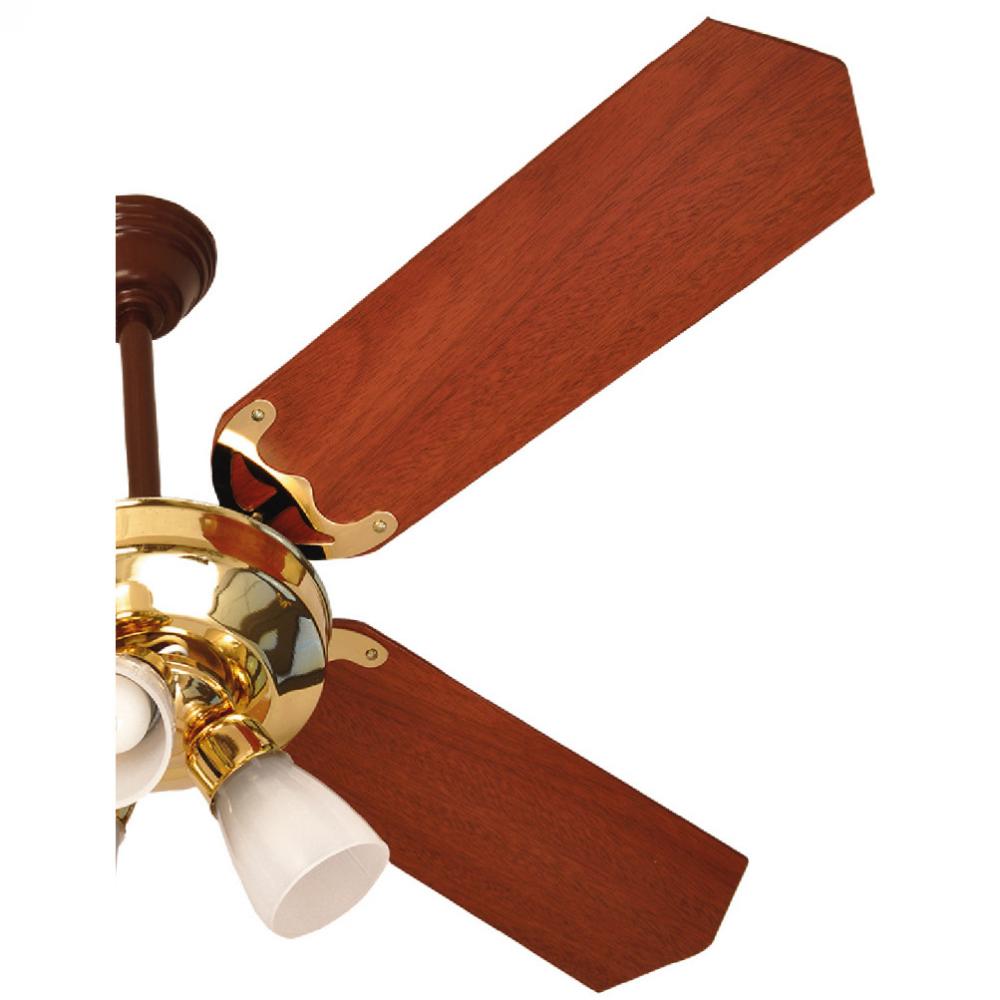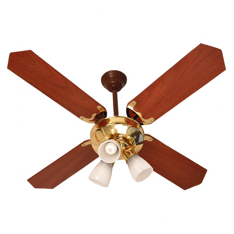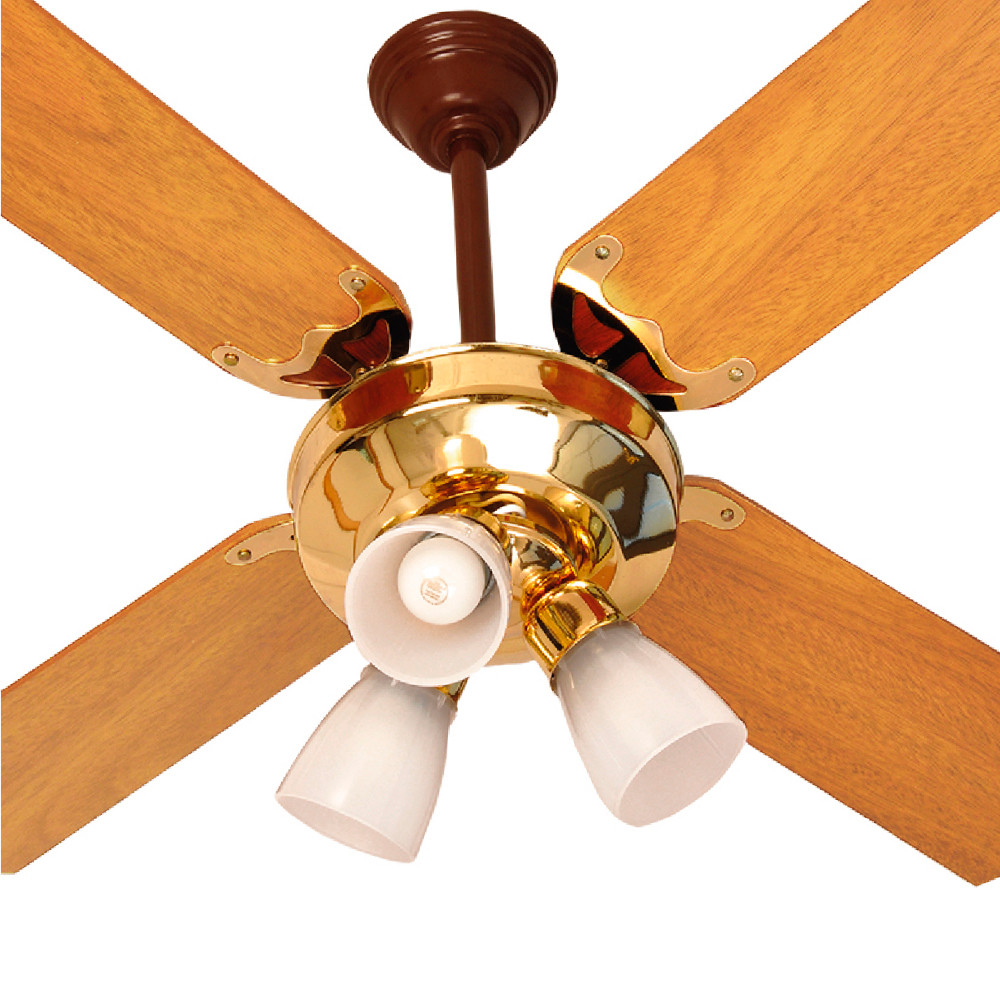 Ventilador de techo con palas de madera MDF (Medium Density Fibreboard) foliado, color cedro y haya, con tapa de acero color dorado.