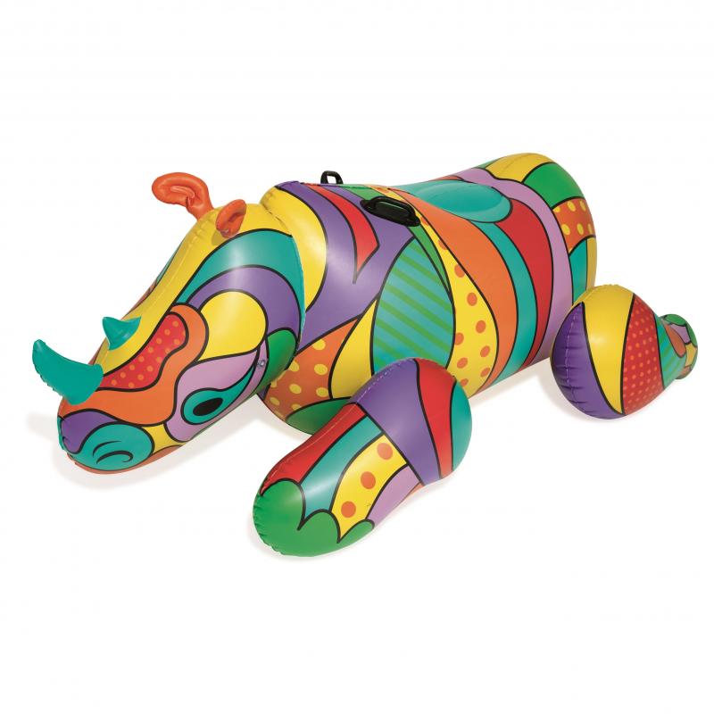 Flotador gigante POP Art Rinoceronte de Bestway. Comodidad y estilo pop para divertirse en el agua. Esta colchoneta gigante con forma de animal llama la atención por su llamativo diseño y sus brillantes colores. También ofrece mucho espacio para sentarse y es para tomar el sol relajadamente en el agua. El hinchable está compuesto por fuerte vinilo y puede sostener encima sin problema a un adulto de hasta 90 kg de peso. También es estable y seguro gracias a su diseño, con 2 asas y 6 cámaras de aire. El estiloso rinoceronte hinchable puede utilizarse a partir de los 14 años de edad. El envío incluye un parche de reparación reforzado.