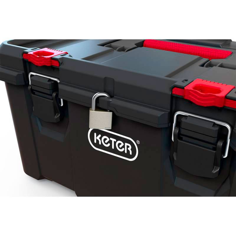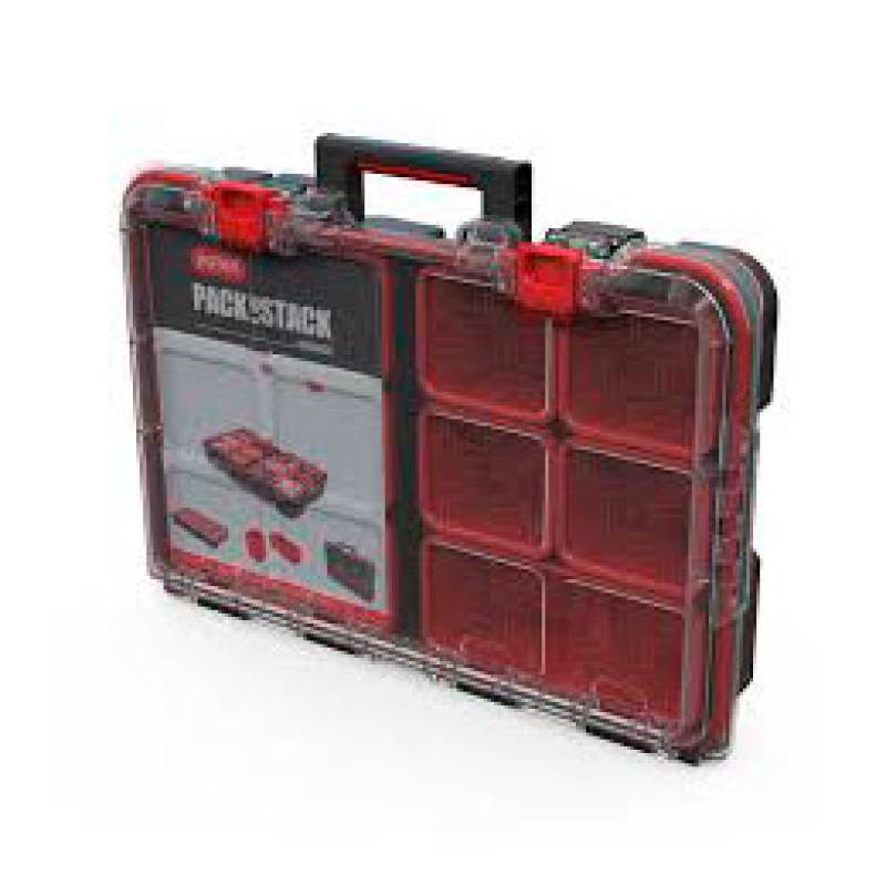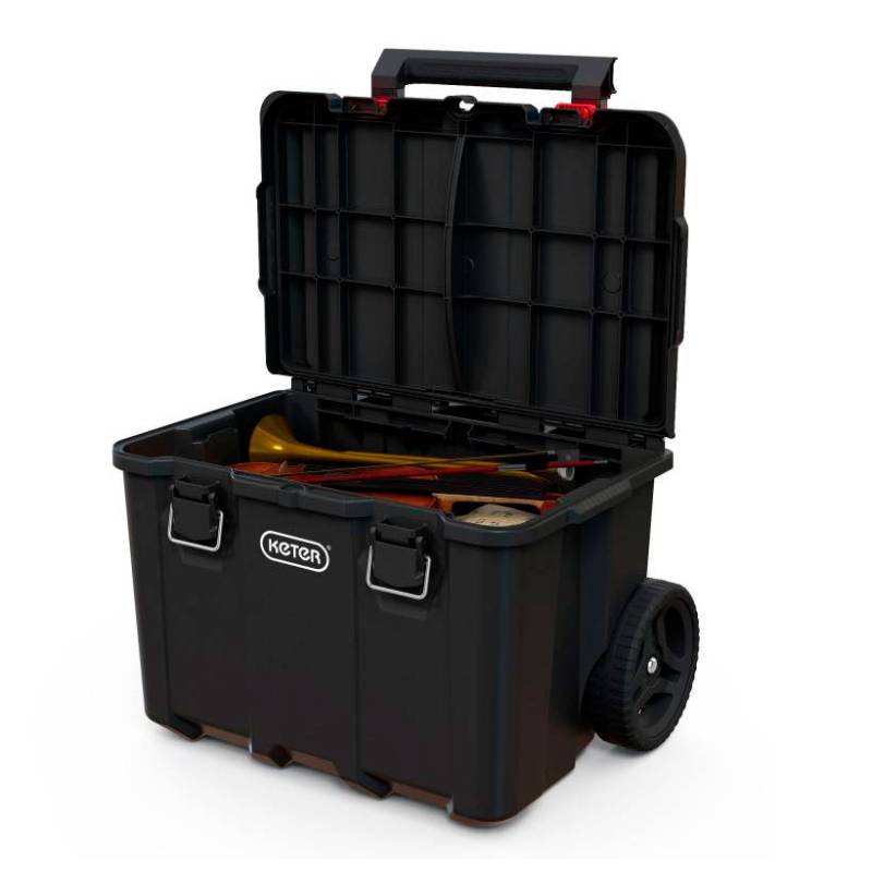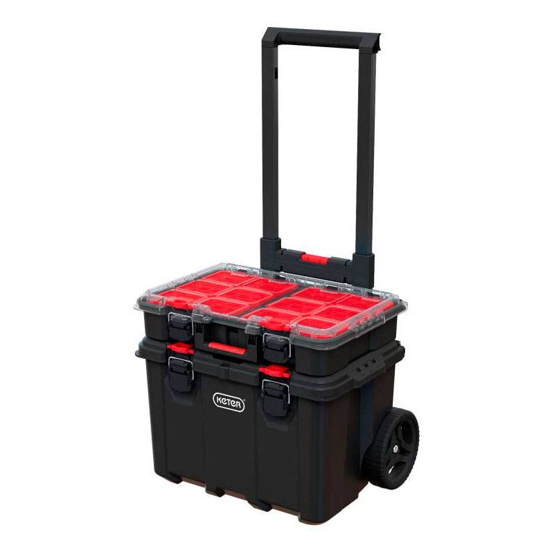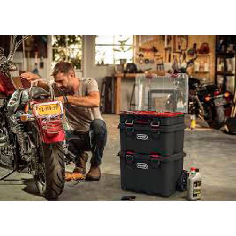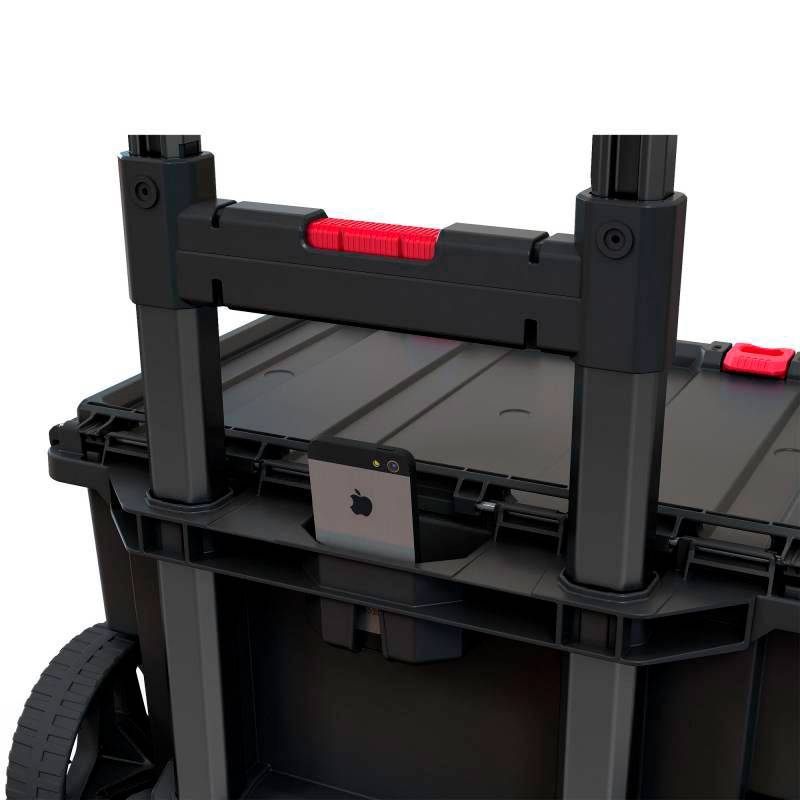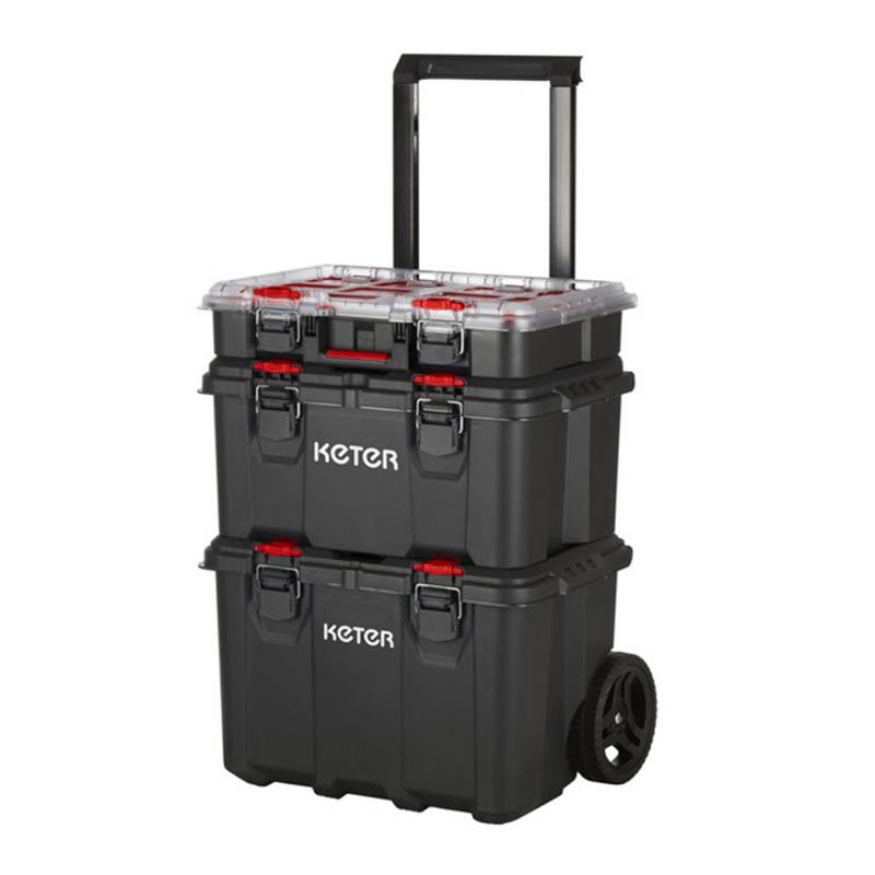 Este sistema con cerradura incluye 3 elementos esenciales para el almacenamiento de herramientas: un carrito móvil, una caja de herramientas y un organizador.