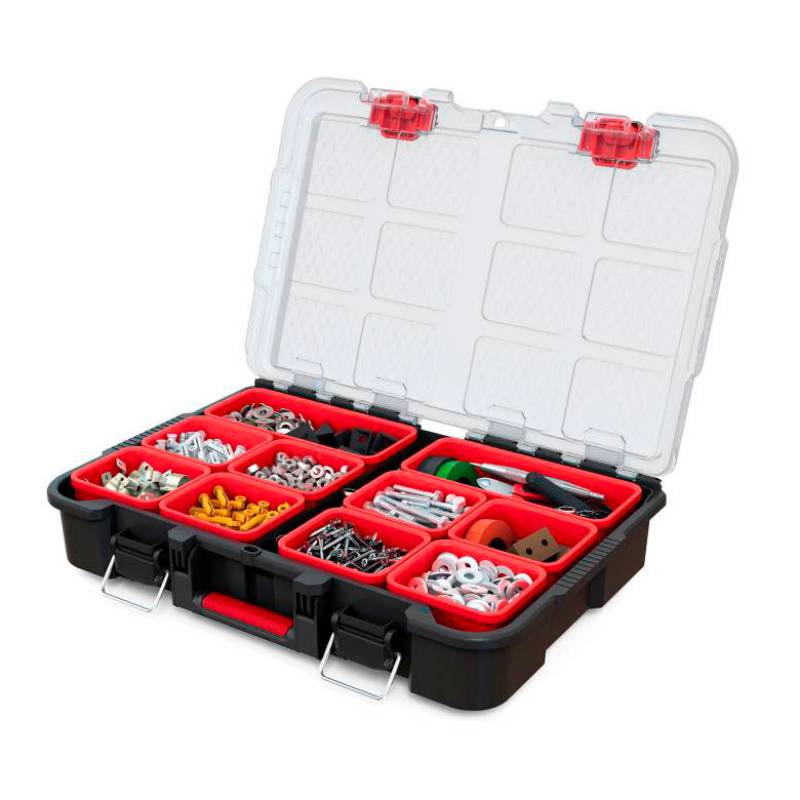 Cuenta con una tapa de policarbonato transparente en el organizador de piezas pequeñas.