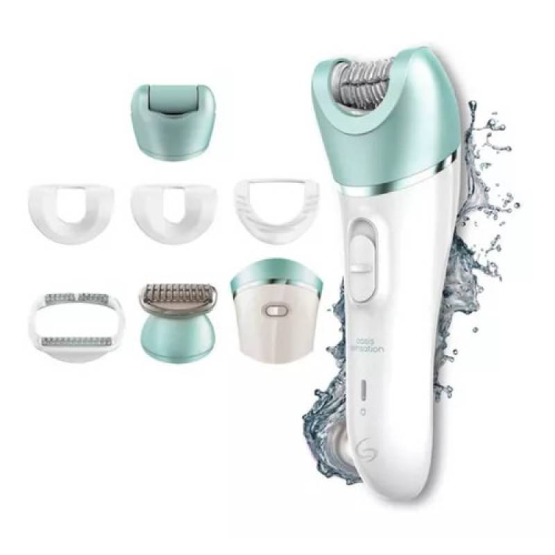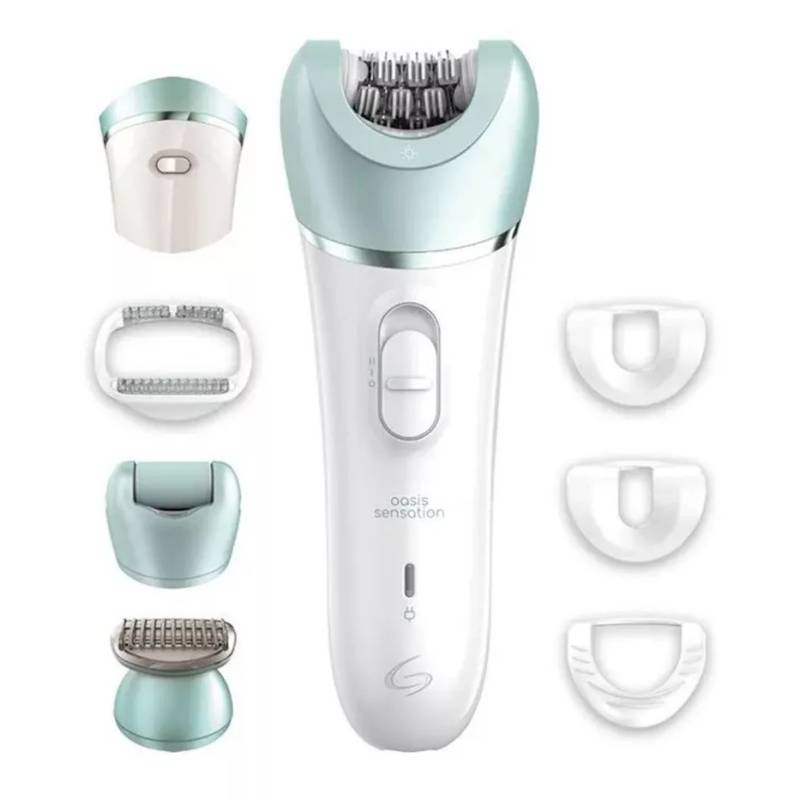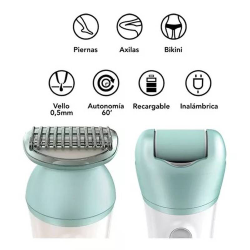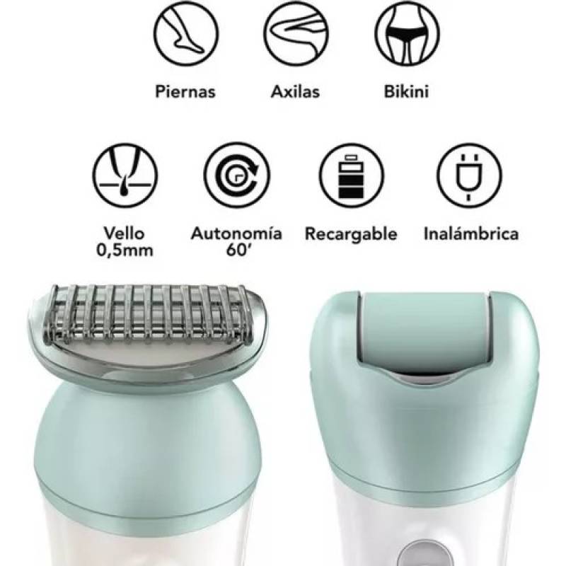 Incluye: cabezal zona sensible, cabezal para rostro, cabezal para estiramiento de la piel, cabezal masajes, cabezal afeitado con peine recortador y cabezal removedor de durezas