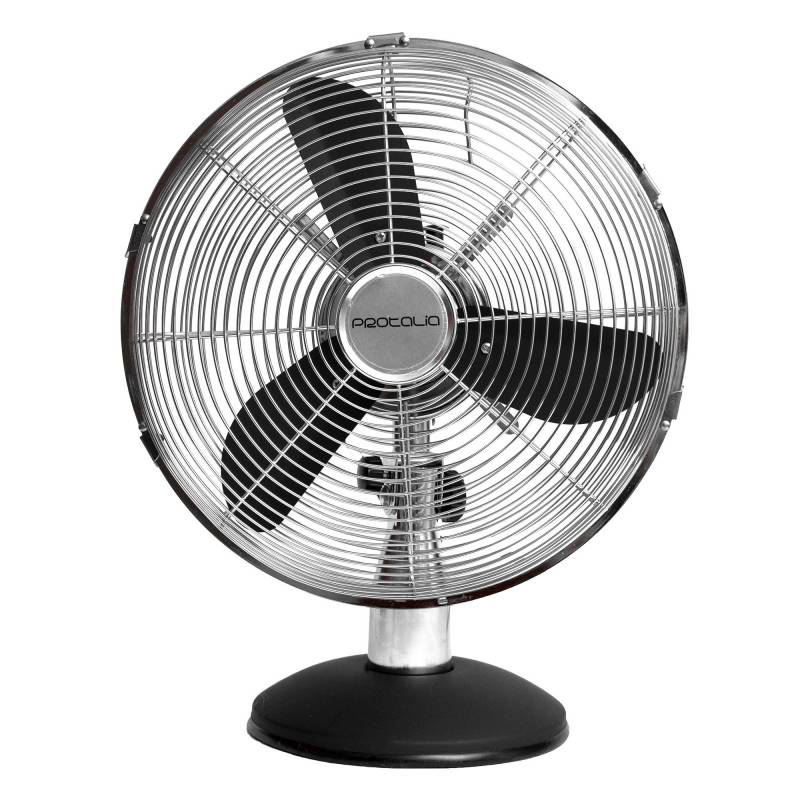 Ventilador de mesa Protalia 12" diseño retro con aspas metálicas de 60 watts de potencia, reja protectora metálica, bitono negro mate cromado.