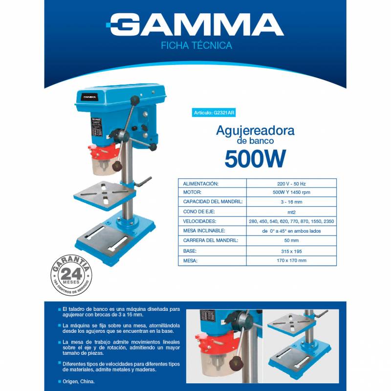 Taladro de banco Gamma. Posee 7 velocidades para adaptarse a los diferentes tipo de perforaciones y materiales. Potencia de trabajo confiable motor de 500W. Gran versatilidad. Admite mechas y accesorios de 3 a 16mm.La mesa de trabajo es regulable de 0º a 45 ambos lados.