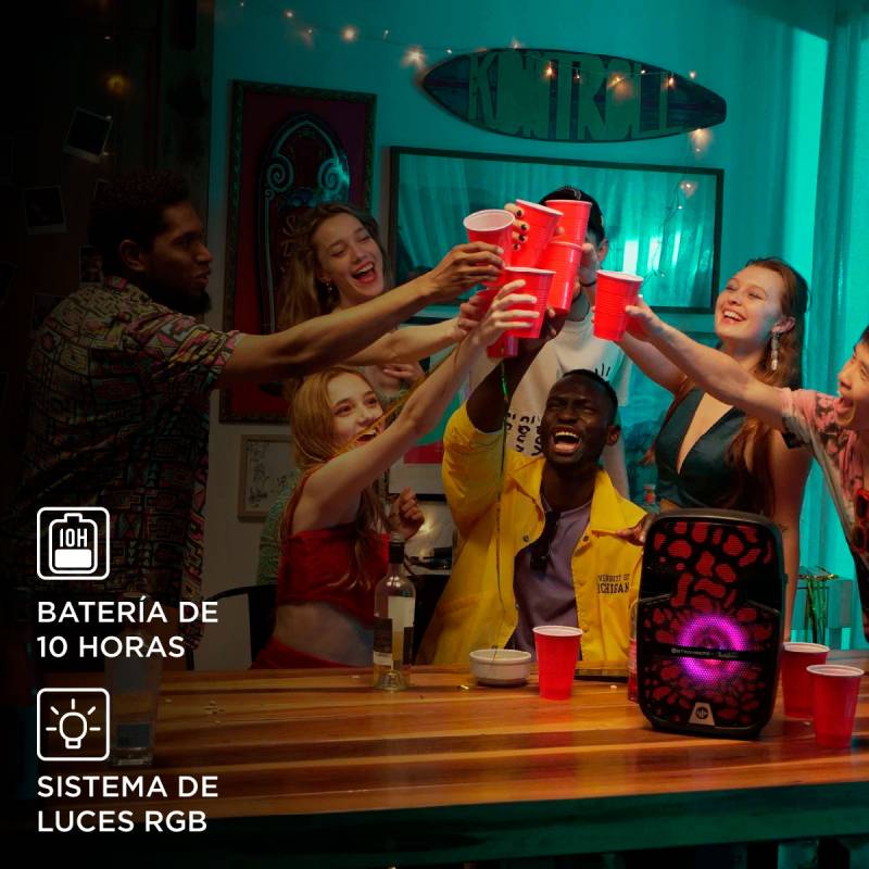 Prepárate para una experiencia musical que te llevará a un nuevo nivel. Ya sea que estés conquistando nuevos territorios o simplemente compartiendo risas con amigos, su batería que dura hasta 10 horas le permitirá ser tu compañero infalible, con sus luces LED podrás crear un ambiente único y vivir una verdadera experiencia.