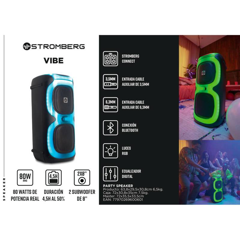 El sonido que deja huella. ¡Dale play a la diversión con el parlante portátil stromberg vibe! Con dos woofers de 8 pulgadas y 80 watts de pura potencia, el stromberg vibe hará que sientas la música en cada fibra de tu ser.