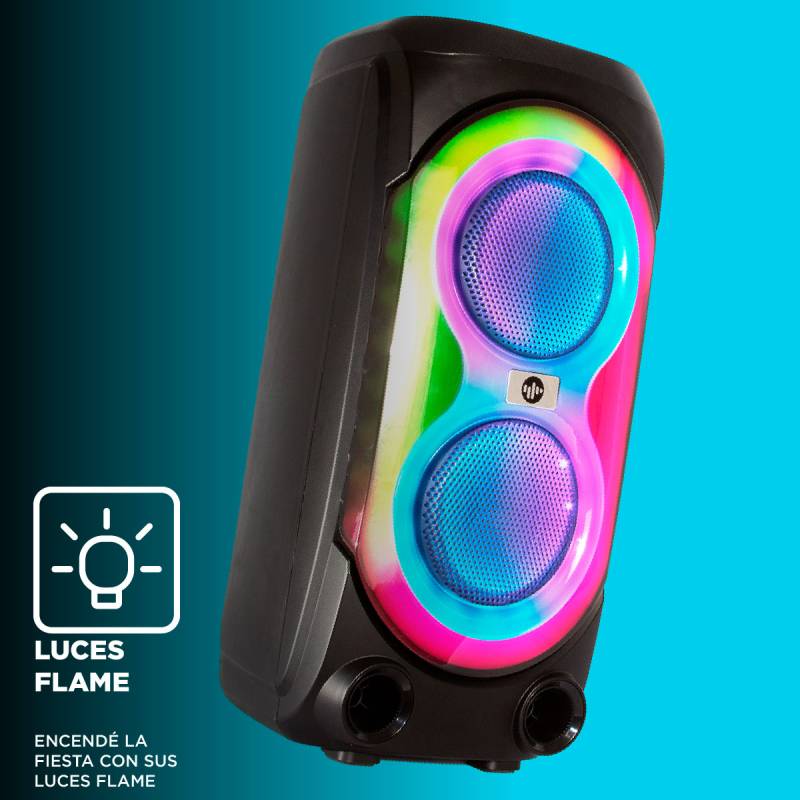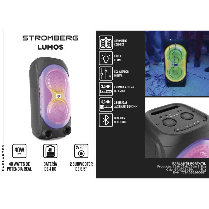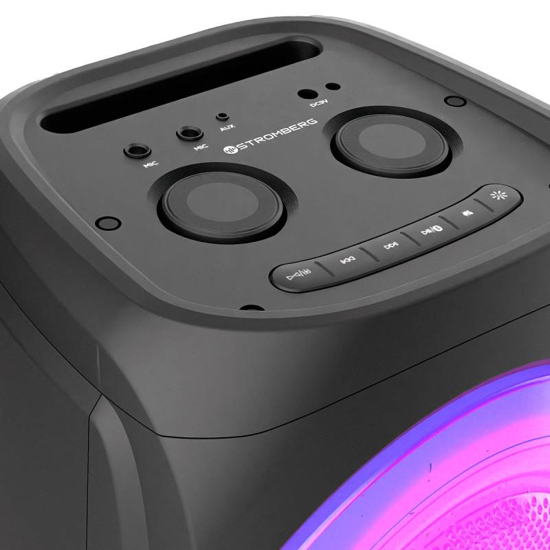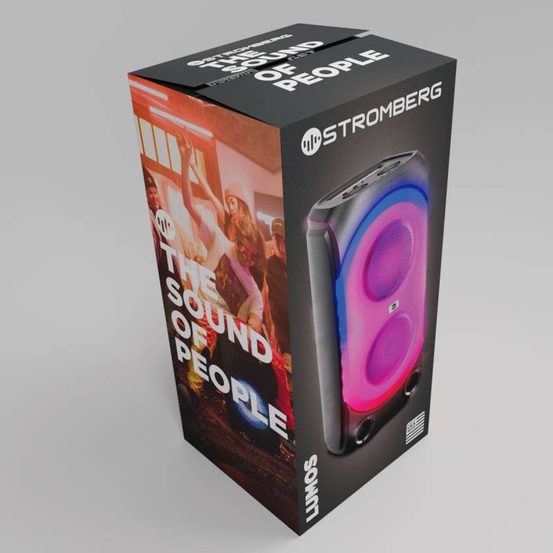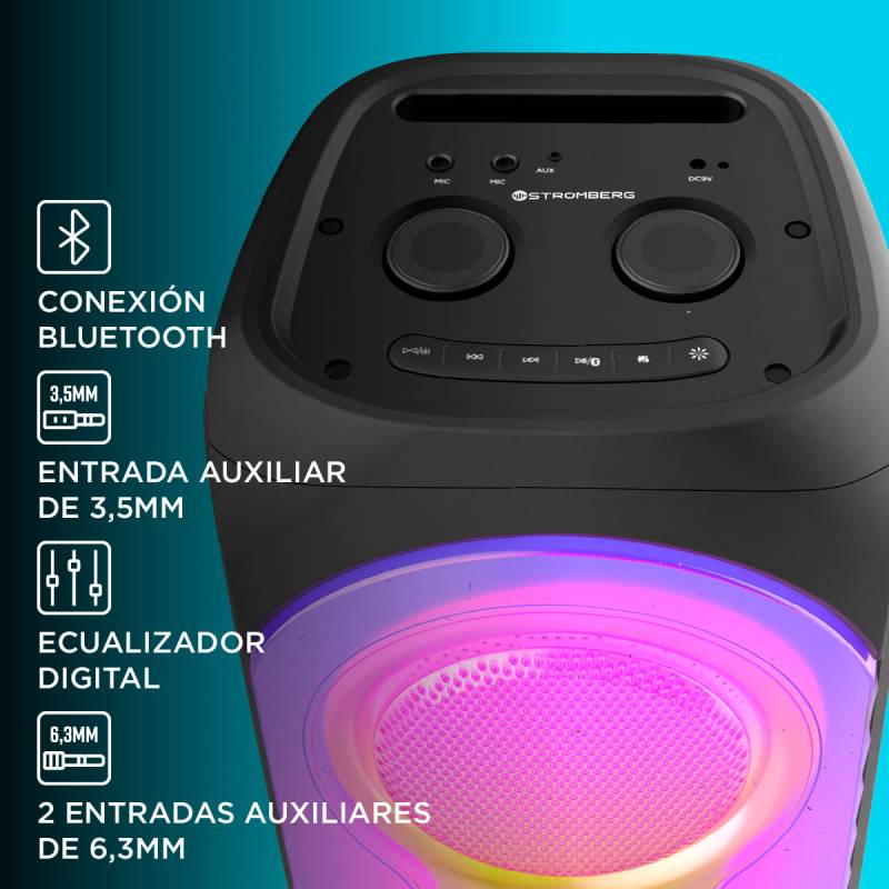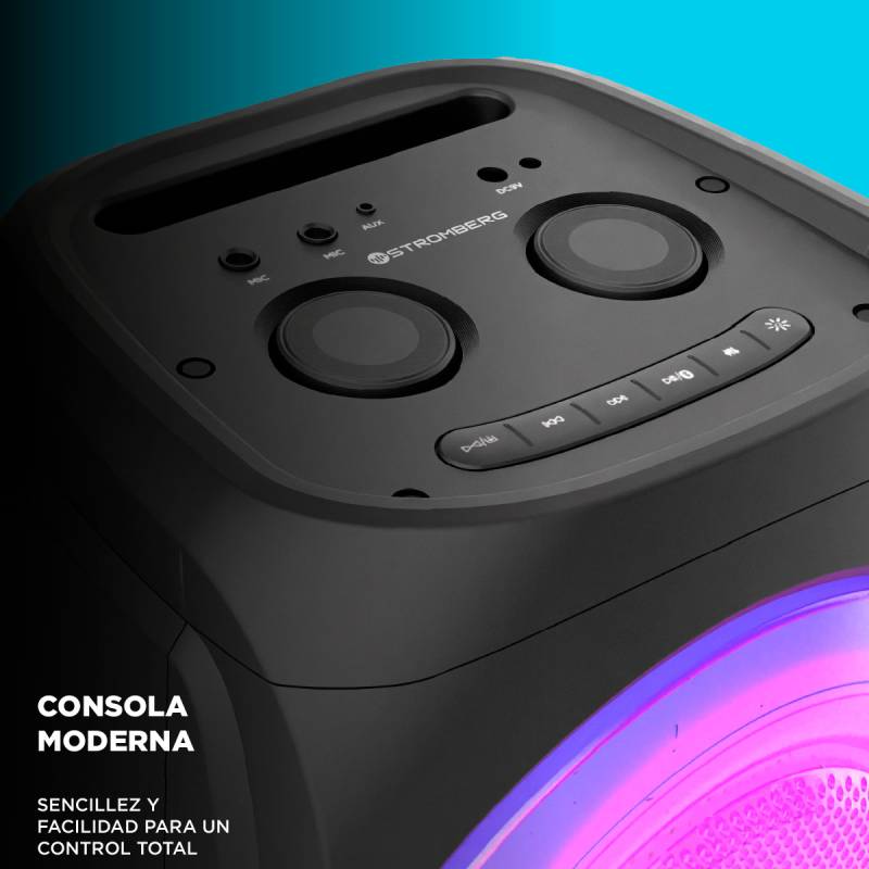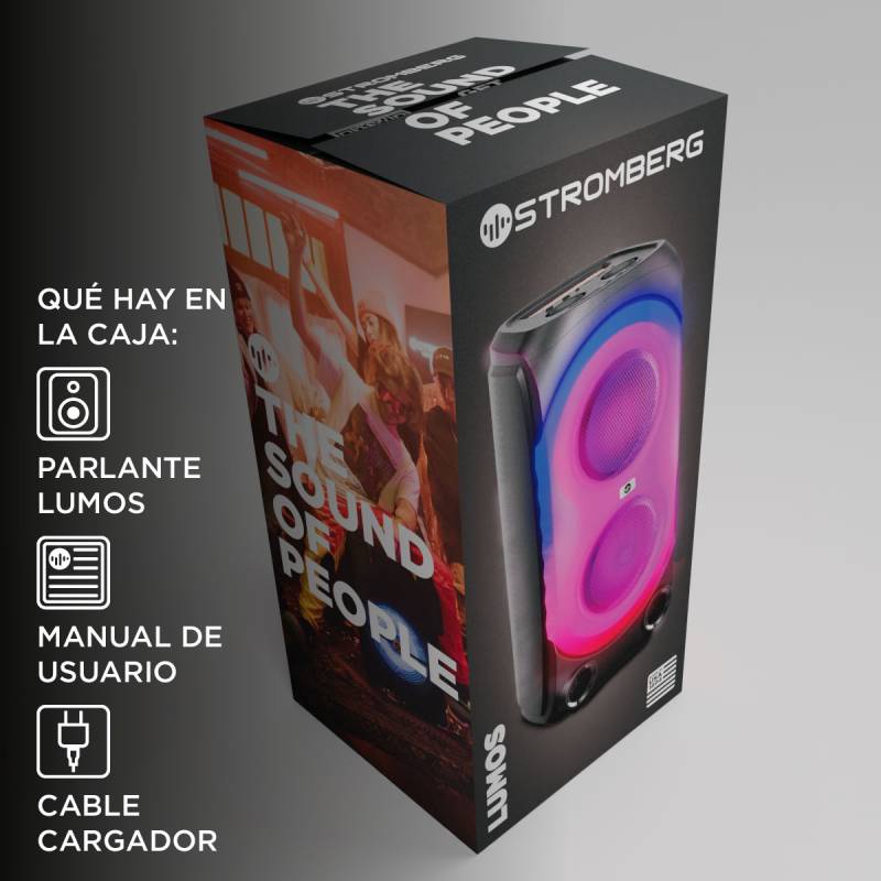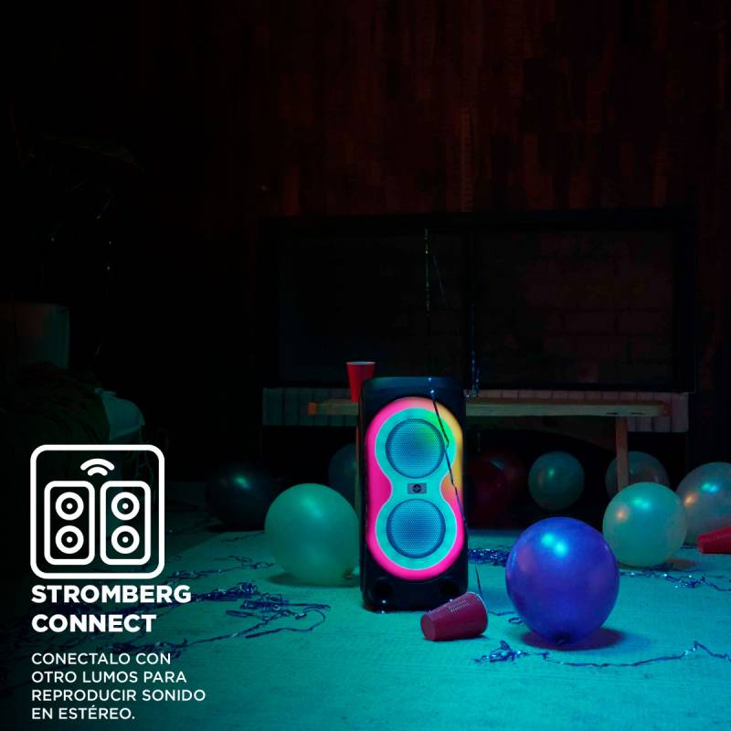 Con el parlante portátil Stromberg lumos, la música se convierte en la guía de tus fiestas, creando un ambiente lleno de energía y vibraciones positivas.