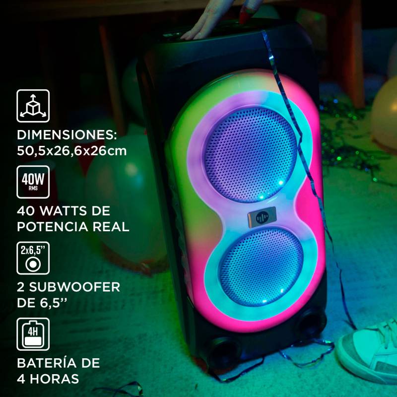 Con sus 2 woofers de 6,5 pulgadas y una potencia de 40 watts, transforma cada reunión en un evento inolvidable.