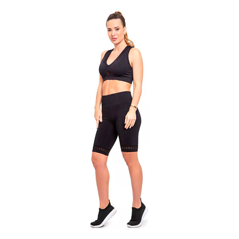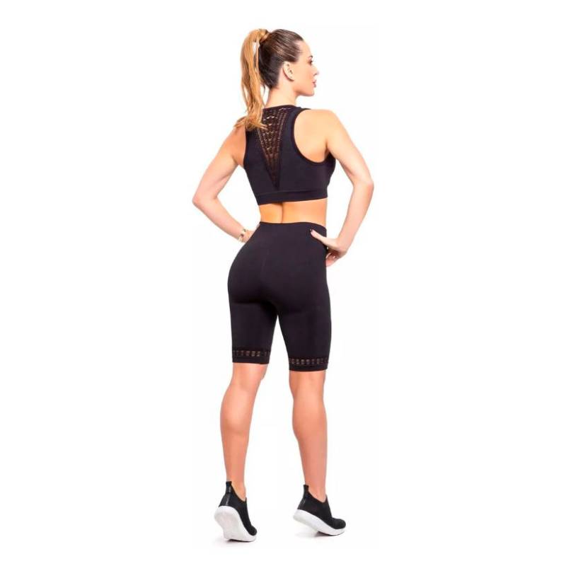 Calza corta con detalles de calados, Model- up sin costura, usando tecnología seamless para ajustar la prenda en los lugares correctos y modelar mejor la silueta. Confeccionada en tejido de microfibra livana. Esta prenda de la línea model-up es una opción para quienes buscan prendas deportivas con un detalle sensual.