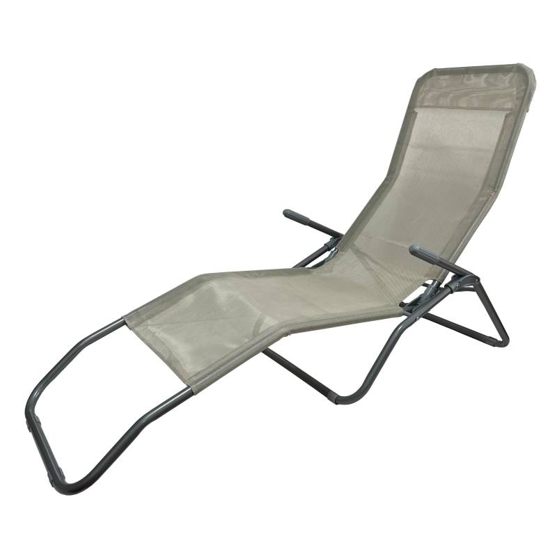 Reposera de caño y textileno con apoyabrazos recubiertos de plástico.
