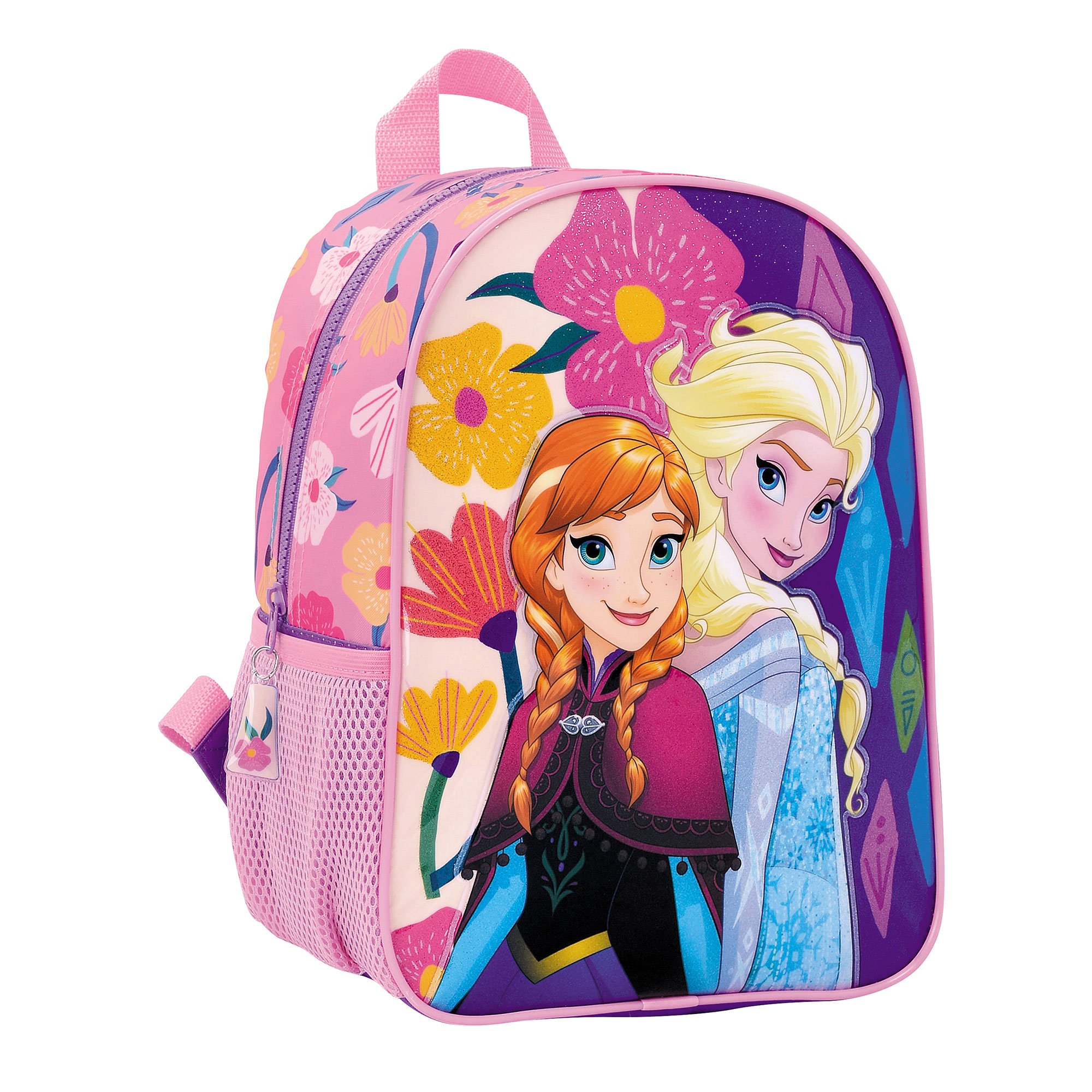 Mochila infantil de las princesas de la peli frozen. Predominan los colores rosas y las flores que acompañan el diseño. Compartimiento principal con el espacio justo para llevar los útiles escolares o ir a pile. Bolsillo lateral de red y tiras regulables. Estampa frontal en relieve de elsa y ana.